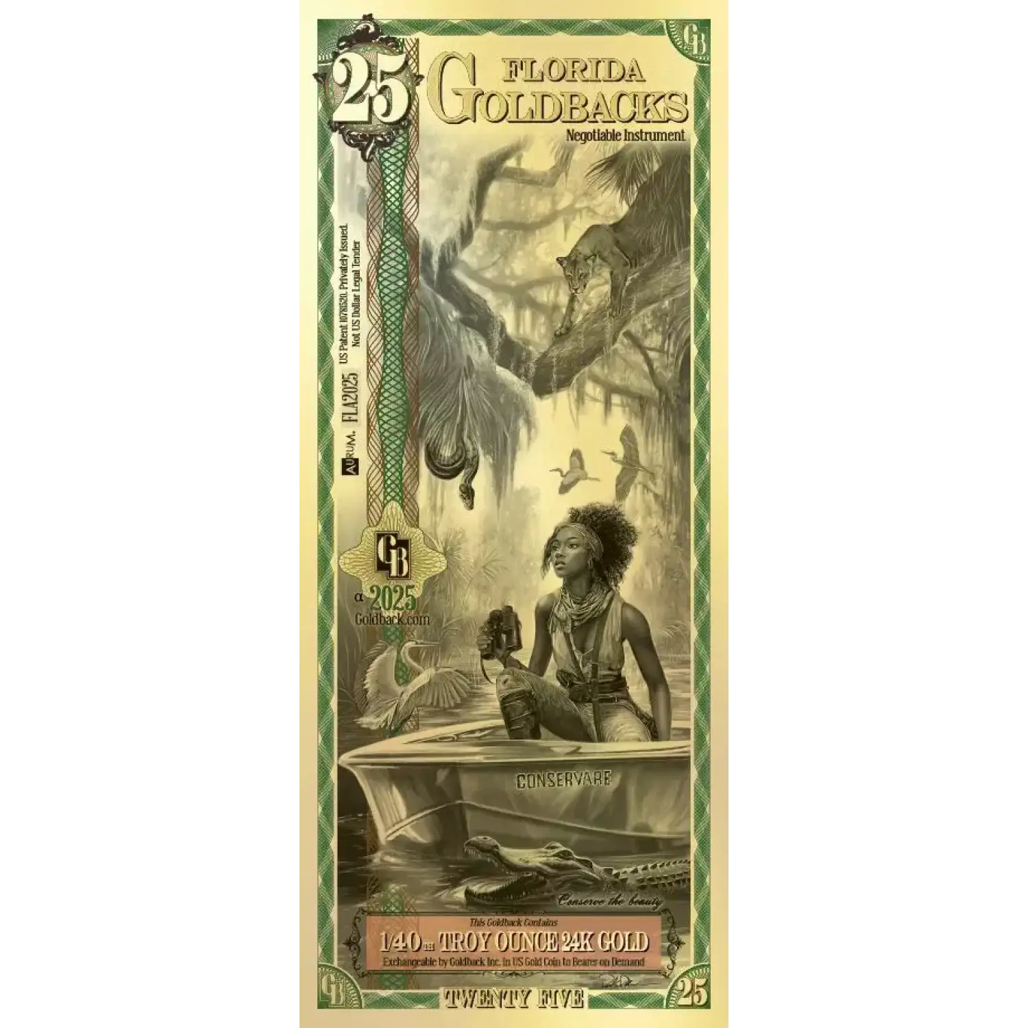These Nevada Goldback foil notes contain 1/40 oz of .999 fine Gold which is the first local, voluntary currency to be made of a spendable, beautiful, physical Gold.