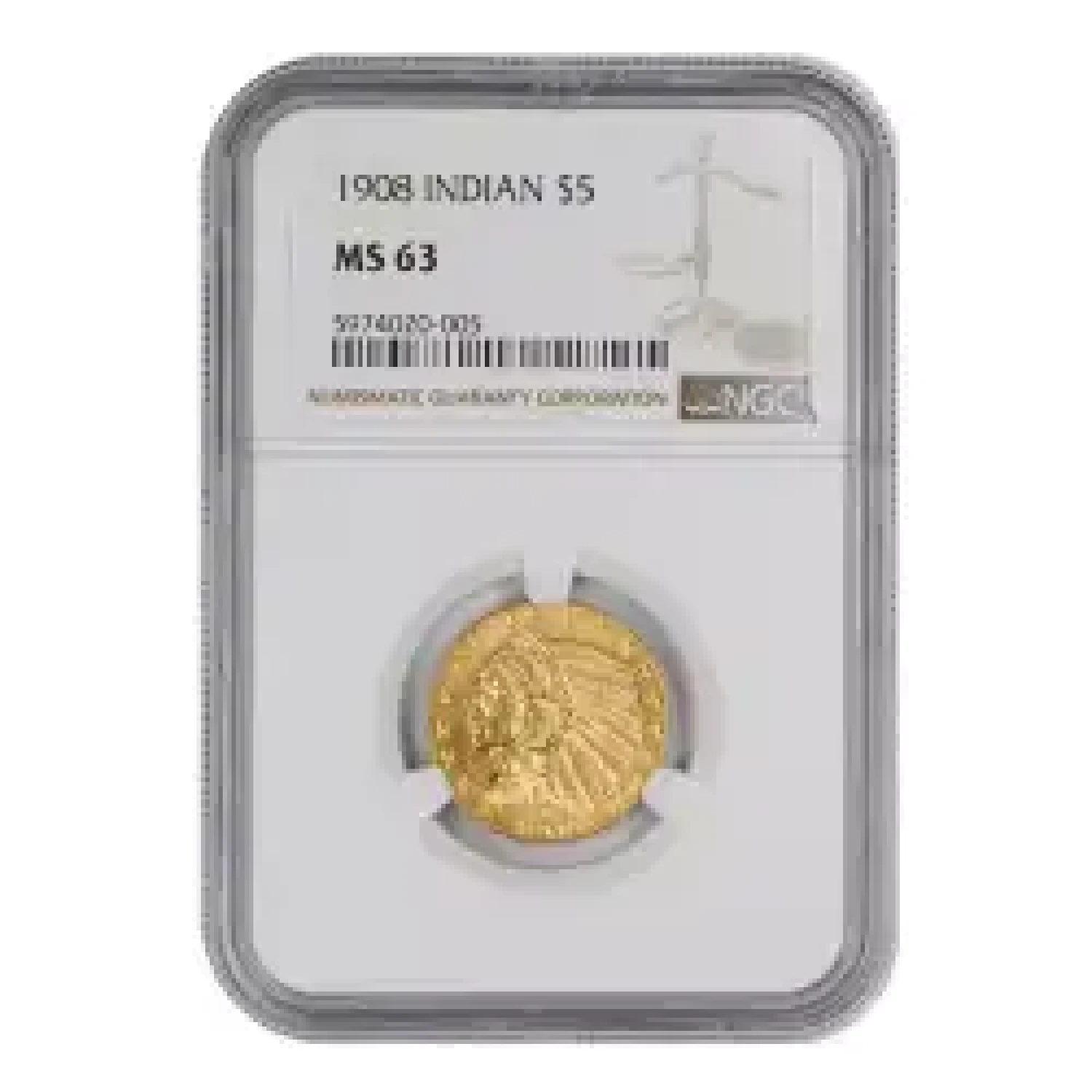 1908 Gold Half Eagles $5 Indian Head NGC MS-63