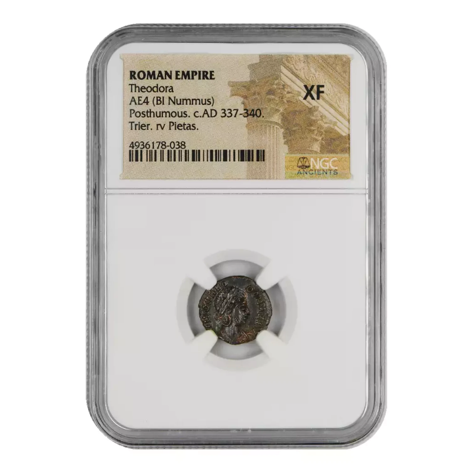 Roman Empire Theodora AE4 (BI Nummus) Posthumous Trier. rv Pietas.