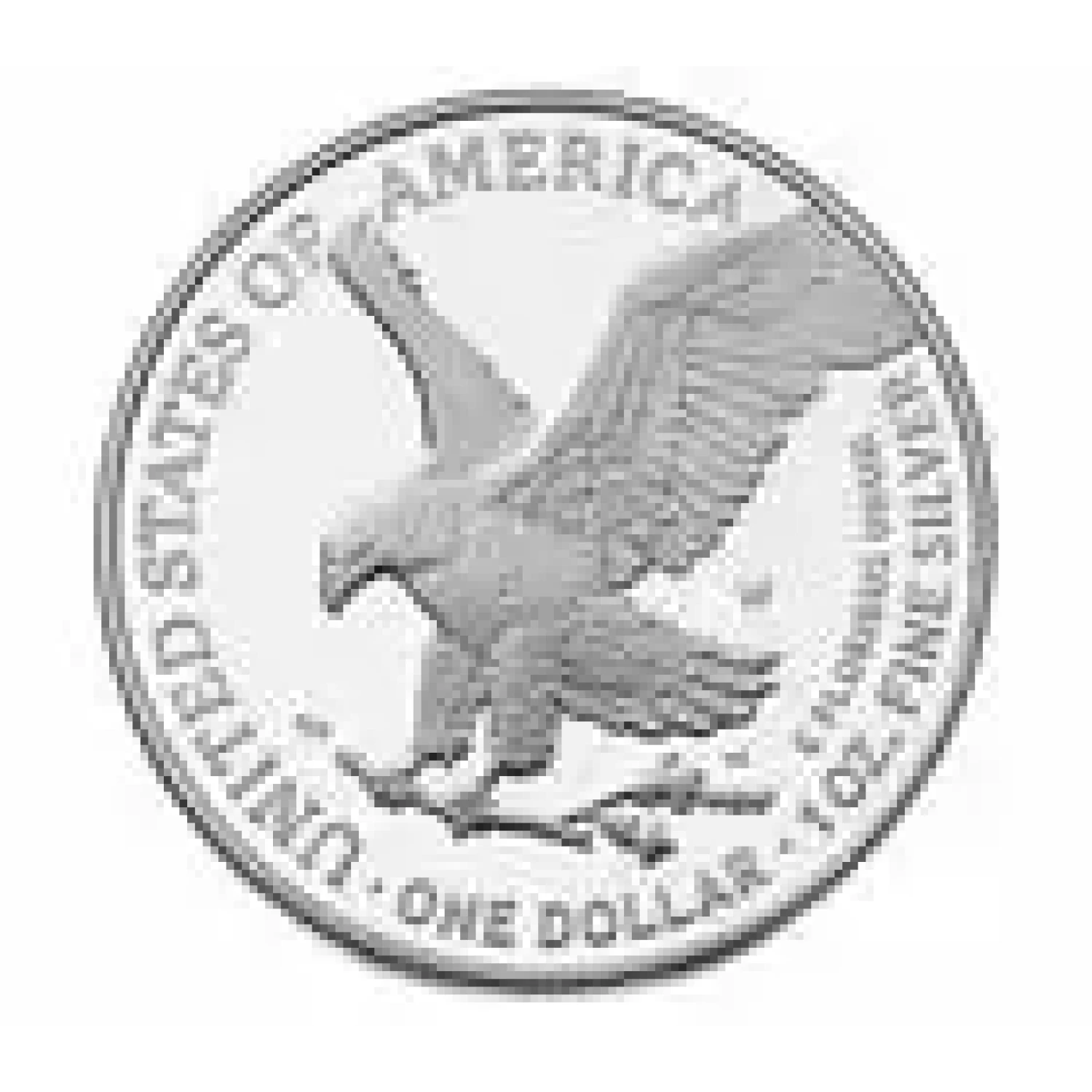 A completely new reverse (tails) design was introduced in 2021. It features an eagle as it approaches a landing, carrying an oak branch as if to add it to a nest. Inscriptions are “UNITED STATES OF AMERICA,” “E PLURIBUS UNUM,” “1 OZ. FINE SILVER,” and “ONE DOLLAR.”