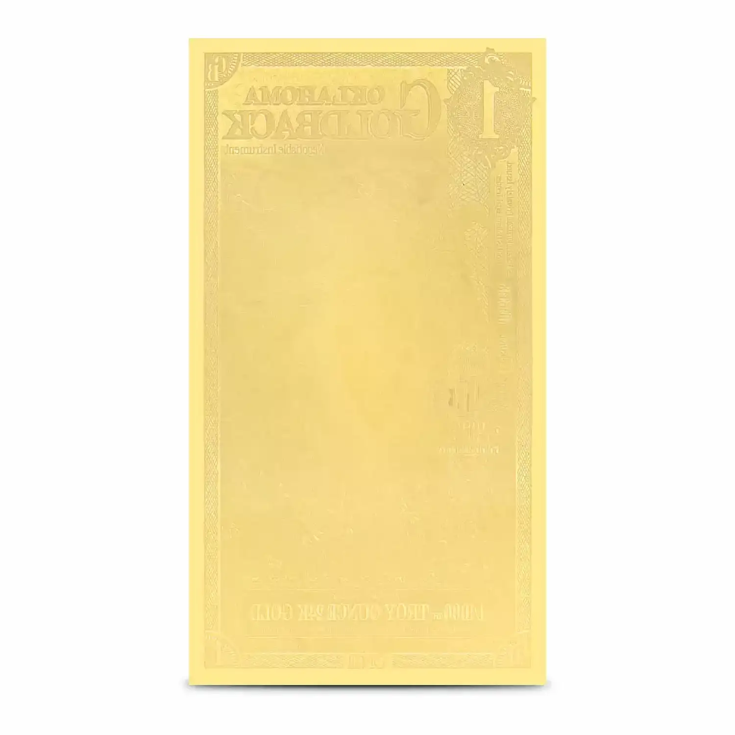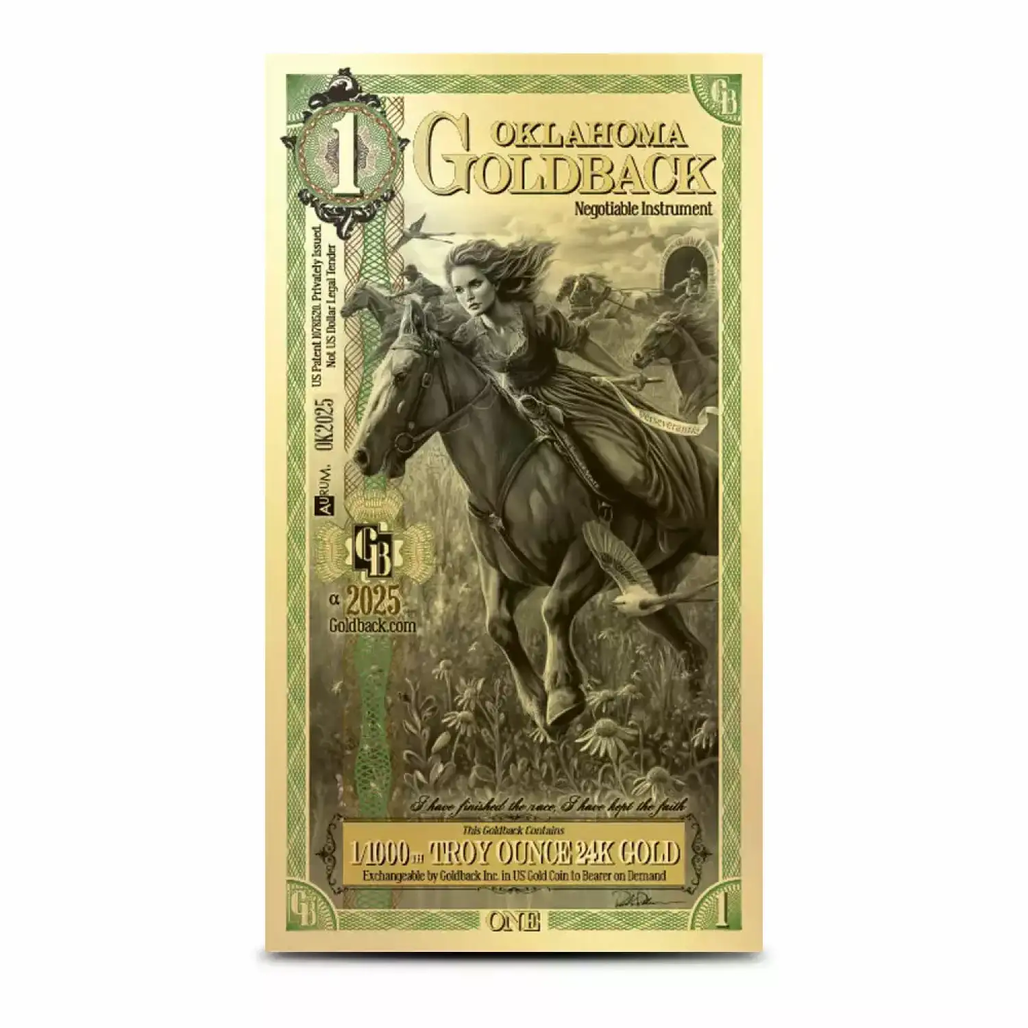 These Oklahoma Goldback foil notes contain 1/1000 oz .999 fine Gold which was the first local, voluntary currency to be made of a spendable, beautiful, physical Gold.