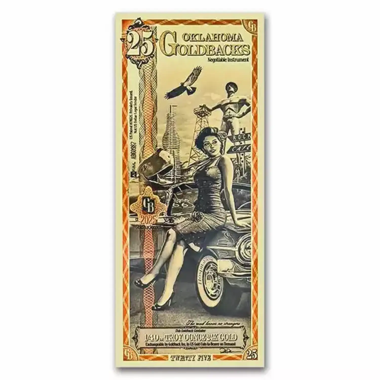 These Oklahoma Goldback foil notes contain 1/40 oz of .999 fine Gold which is the first local, voluntary currency to be made of a spendable, beautiful, physical Gold.