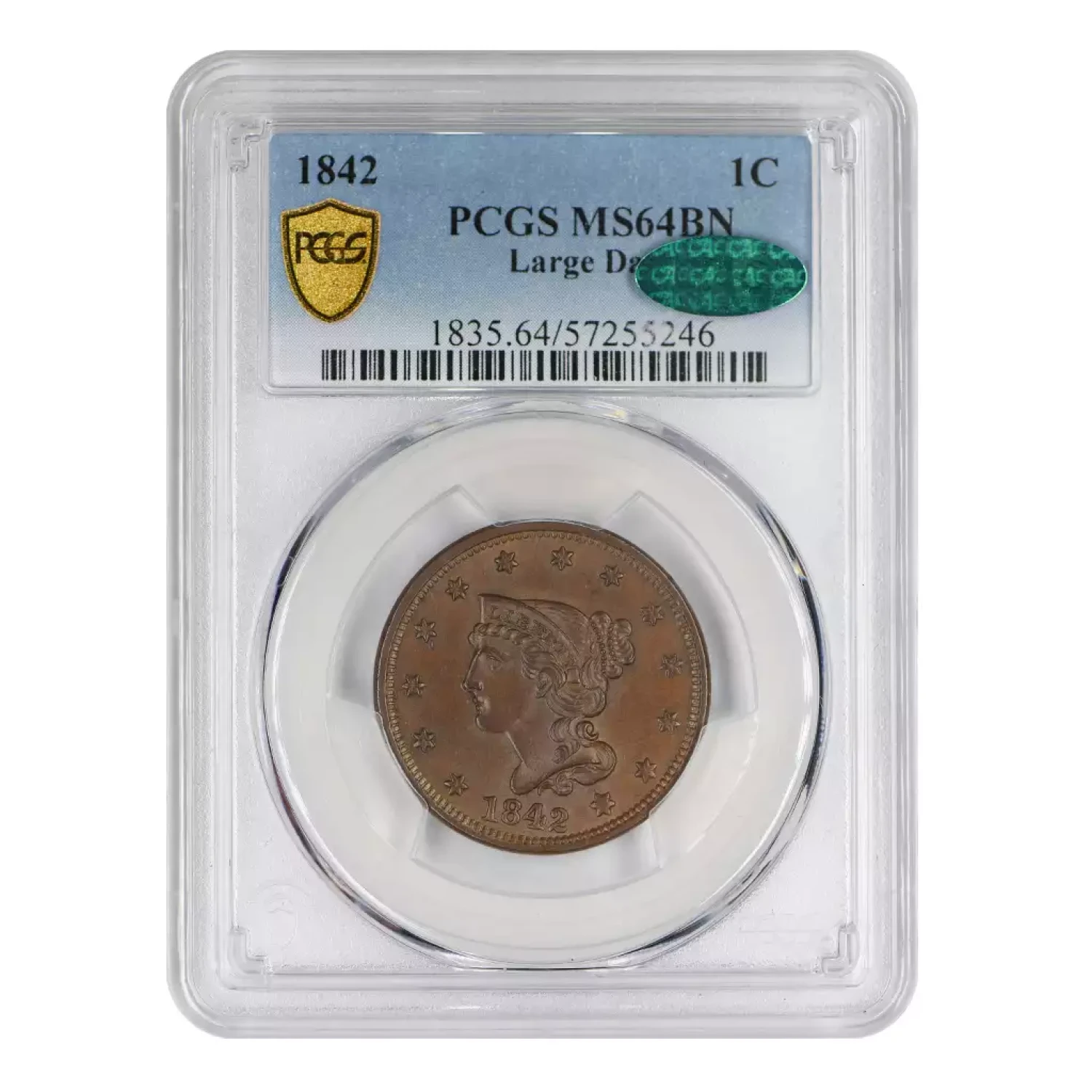 1842 P Braided Hair Cent PCGS MS-64 Large Date BN CAC