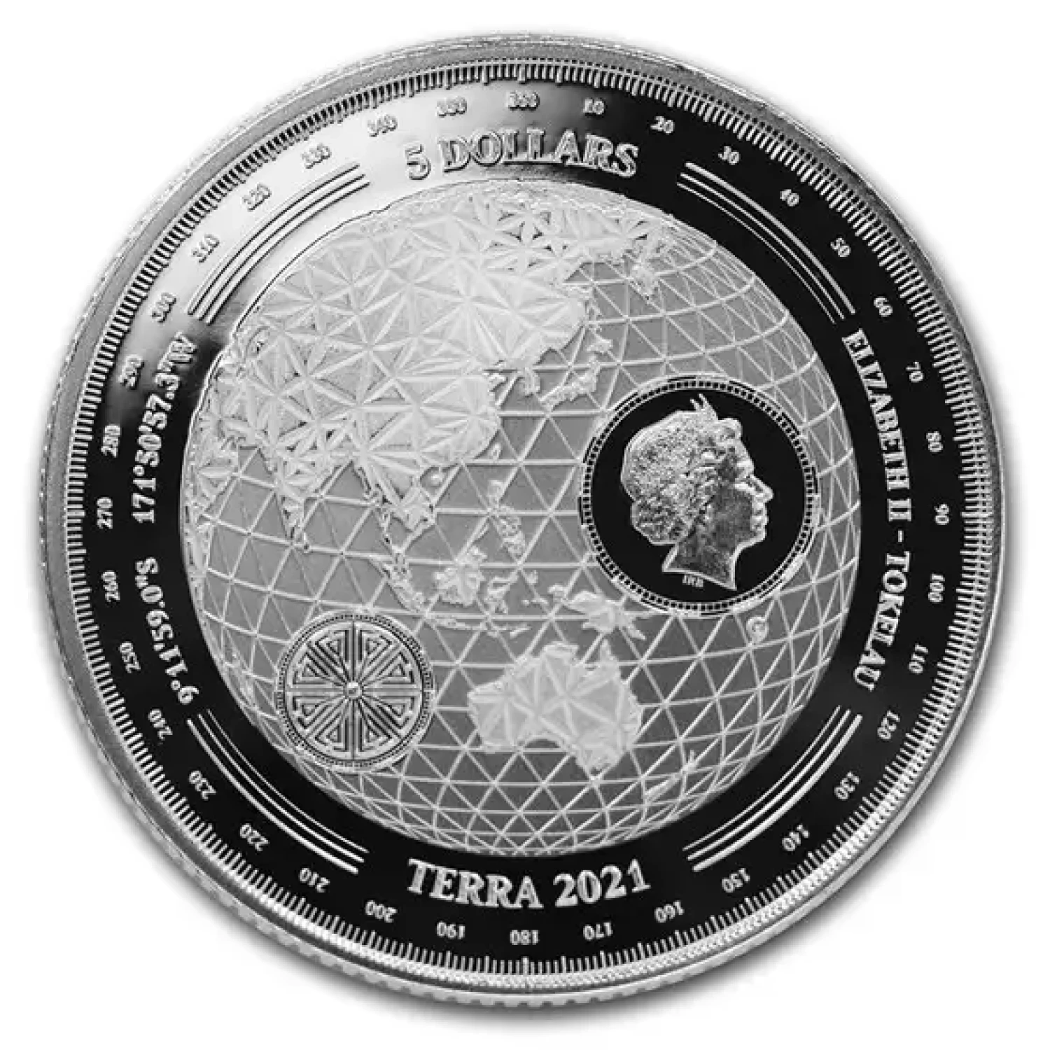 Obverse: Image of planet Earth, with compass themes on the image as well as the border. Also featured on the obverse are the weight, purity and the phrase "Serva Me, Servabo Te."