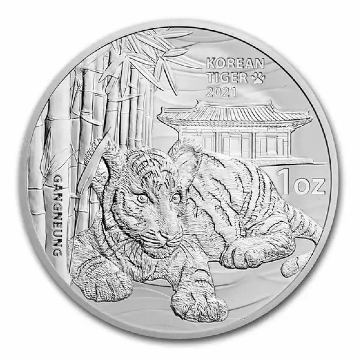 Reverse: Features the Korean Peninsular embodied in "Hangul," the Korean alphabet over a tiger print. The KOMSCO logo is also incorporated into the design along with .999 purity shown with latent letter changing technology.