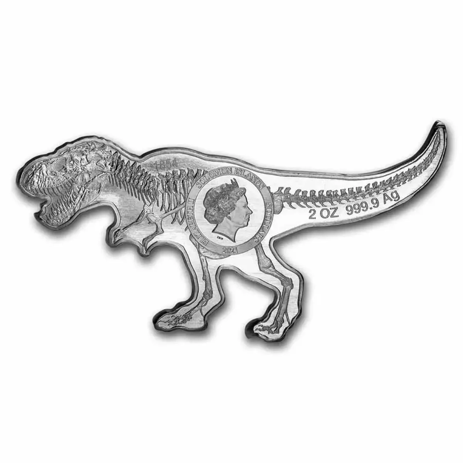 Obverse: depicts a modern-day view of a T. rex skeleton and displays a right-facing profile of Queen Elizabeth II, along with the year and face value.