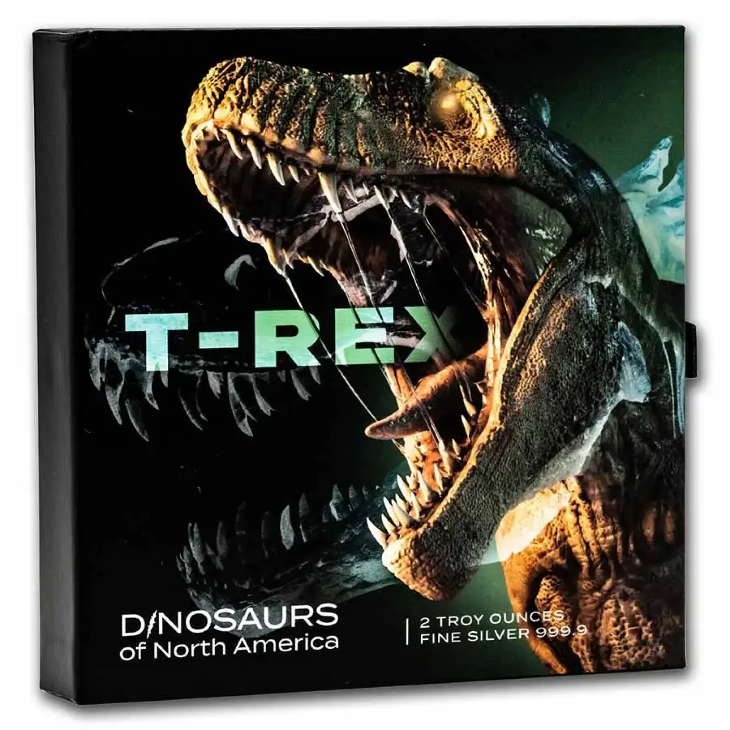 Reverse: Depicts a prehistoric glimpse of a living T. rex.