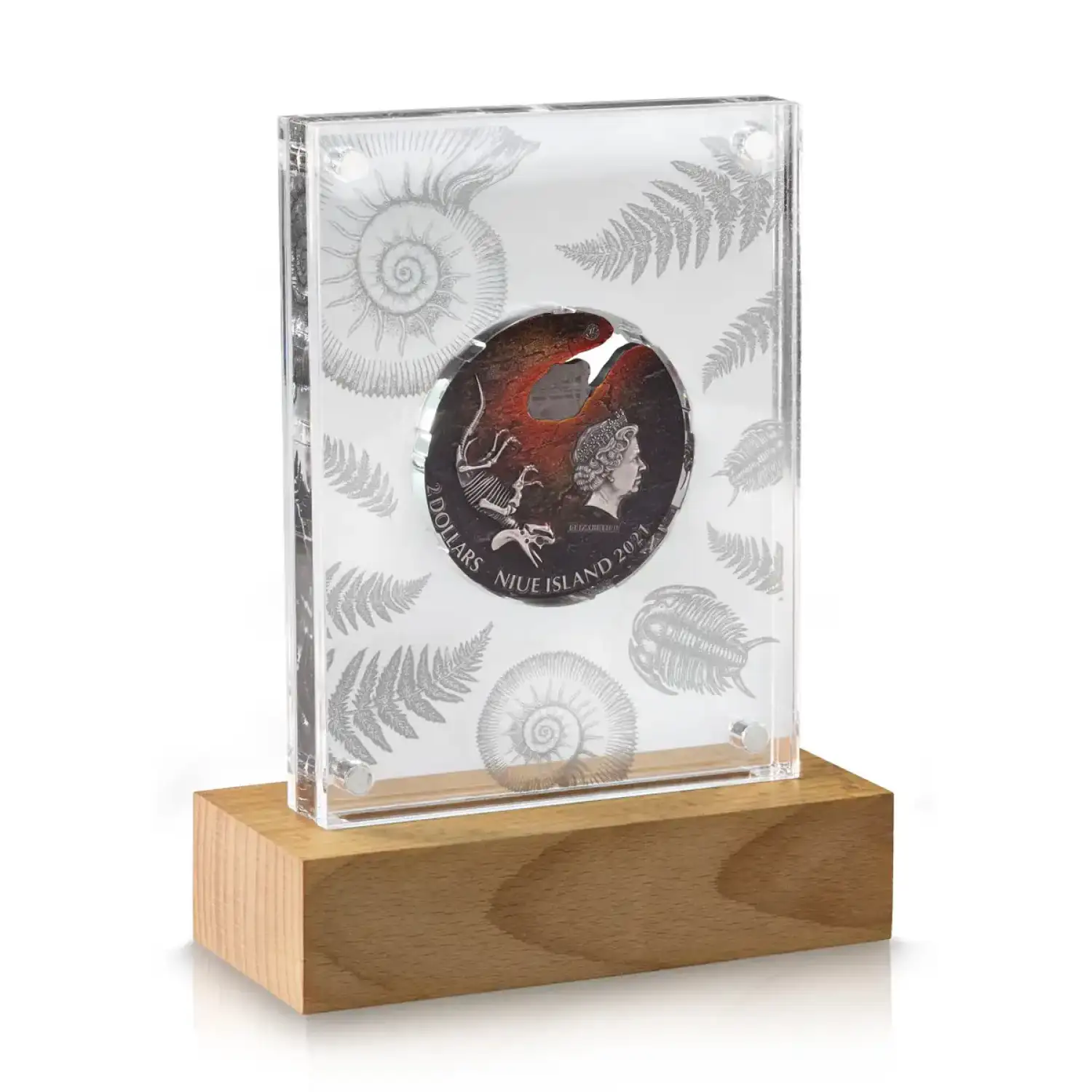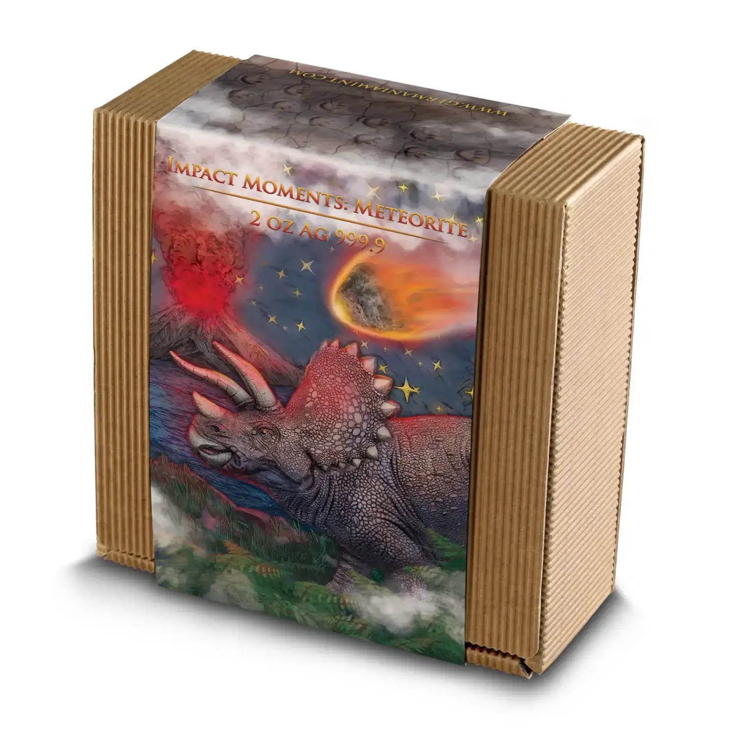 The Niue Island – 2021 Impact Moments: Meteorite 2 oz Silver High Relief coin was created by Germania Mint in partnership with Numizzmi. The two companies have teamed up to create a unique coin with a motif referring to the extinction of dinosaurs as a result of a meteorite hitting the earth 66 mln years ago. Each coin contains a piece of this extremely rare fragment of galactic rock called Muonionalusta – a more than 4.5 billion year old meteorite discovered in 1906 in northern Sweden.