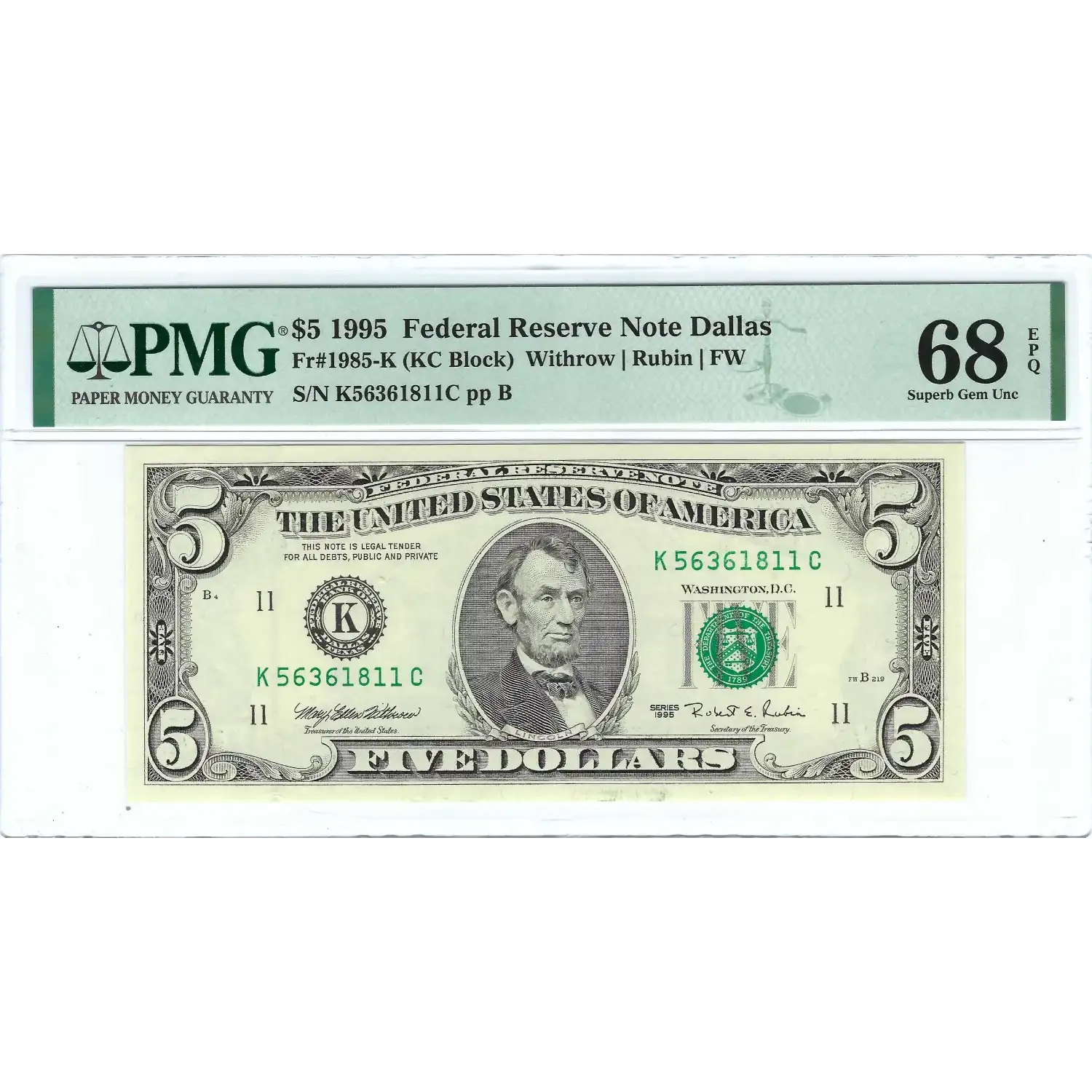 $5 1995 Small Size Federal Reserve Note - Dallas PMG 68EPQ Superb Gem Unc FR1985K