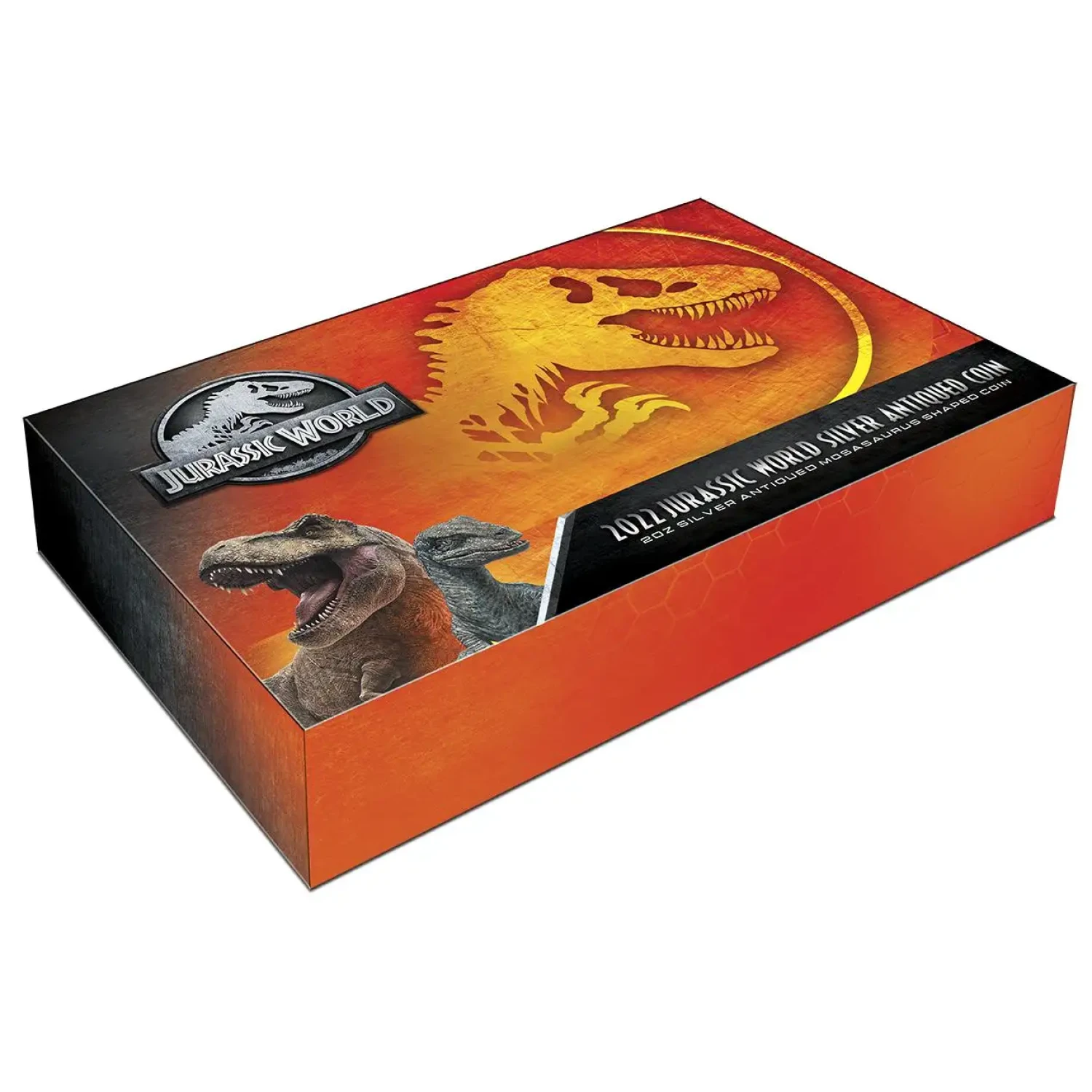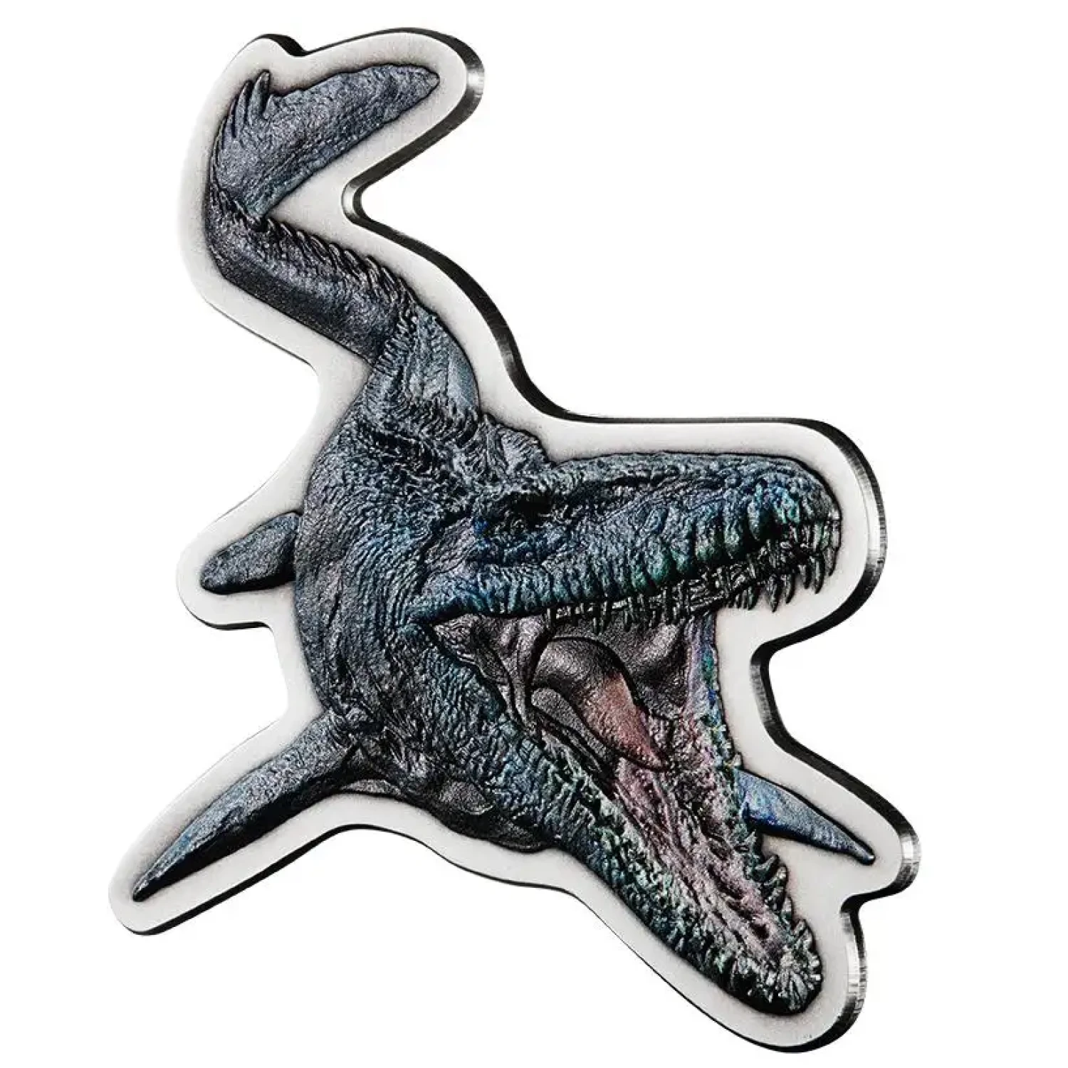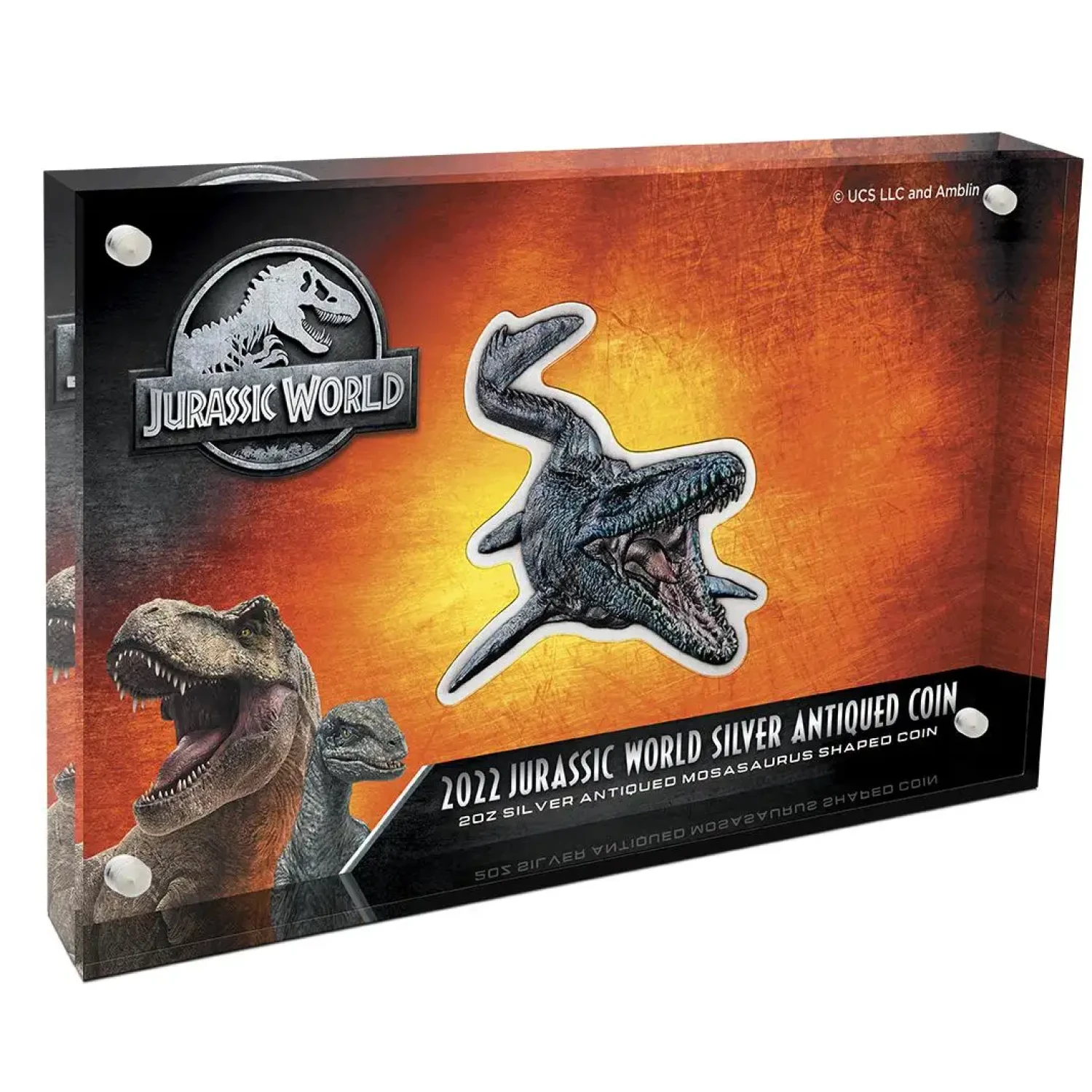 To celebrate the Jurassic World Film franchise, The Coin Company is excited to present the 2022 Jurassic World 2oz Silver Antiqued Mosasaurus Shaped Coin.