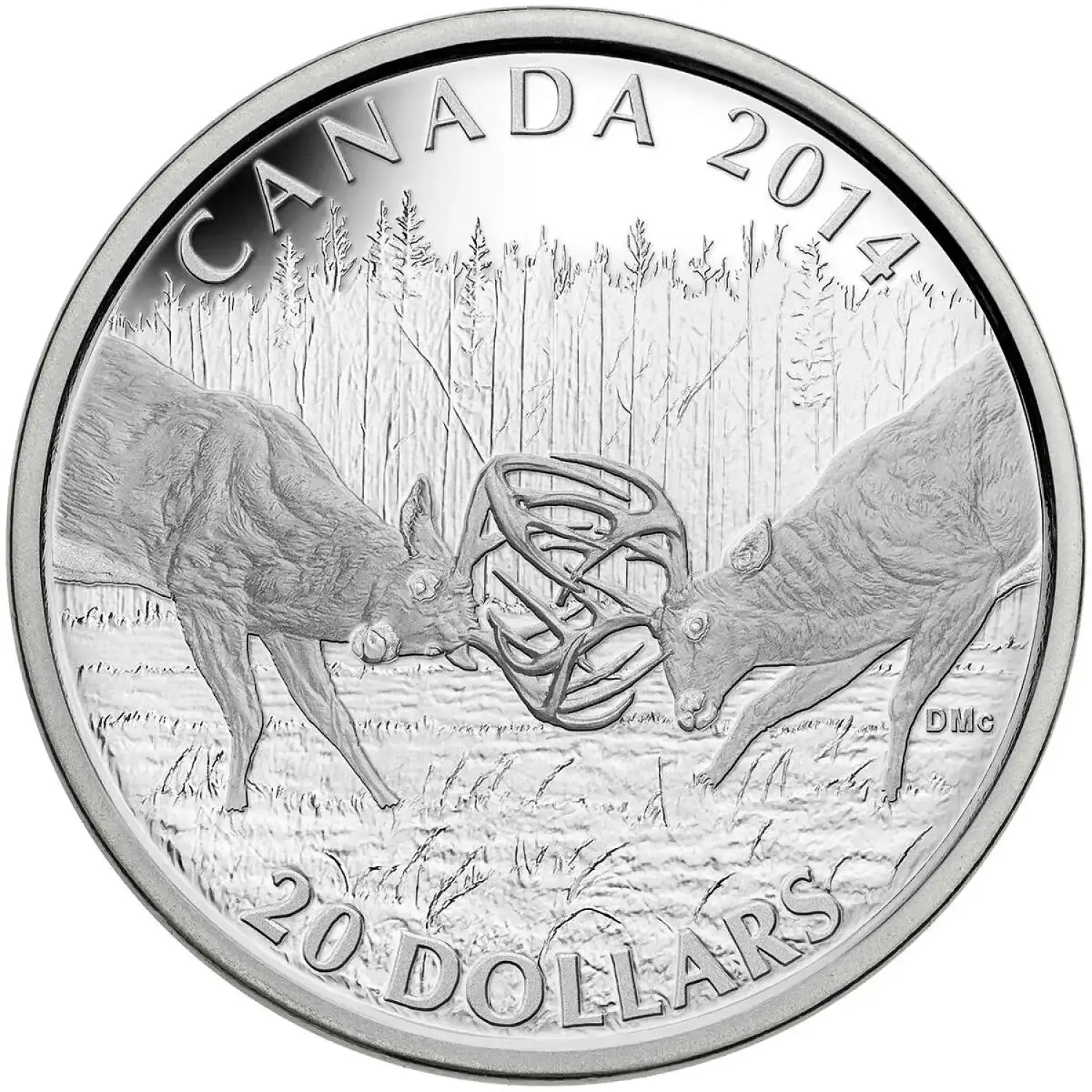 This 2014 pure silver $20 proof coin takes you ringside to witness an intense confrontation between two male white-tailed deer during the height of mating season. The two powerful bucks are locking their impressive multi-tined antler racks in a battle for supremacy and their choice of a mate. The coin weighs just over one ounce of fine silver, and has a mintage limited to just 7,500. GST/HST exempt.