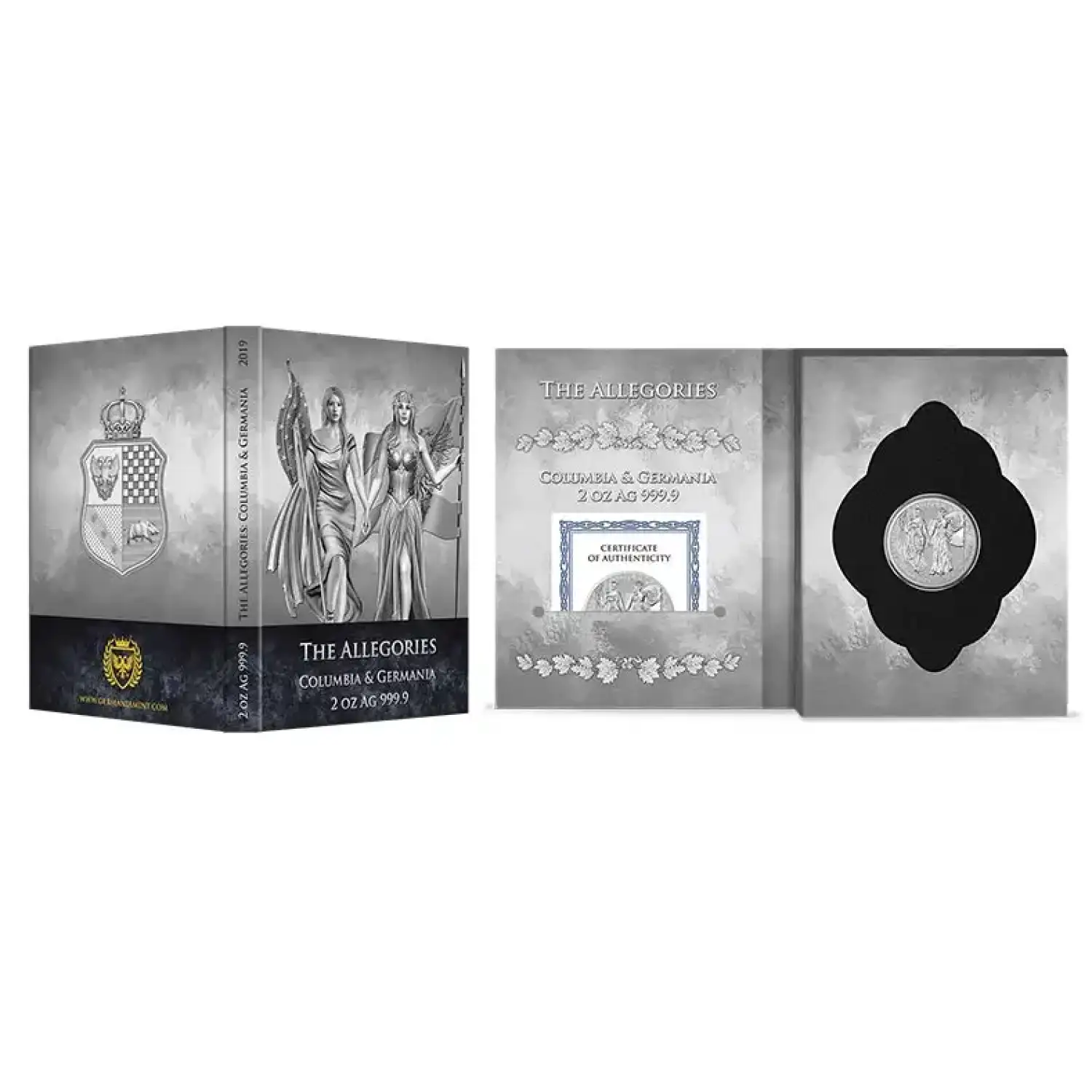 In the top left corner of the crest there is the Germania Mint’s Bicephalous eagle a Roman mythology symbol associated with Janus, the god of all origins, guardian of doors, gates, passages and bridges, the patron of contracts and alliances. Heads facing the opposite symbolize the past and the future.
