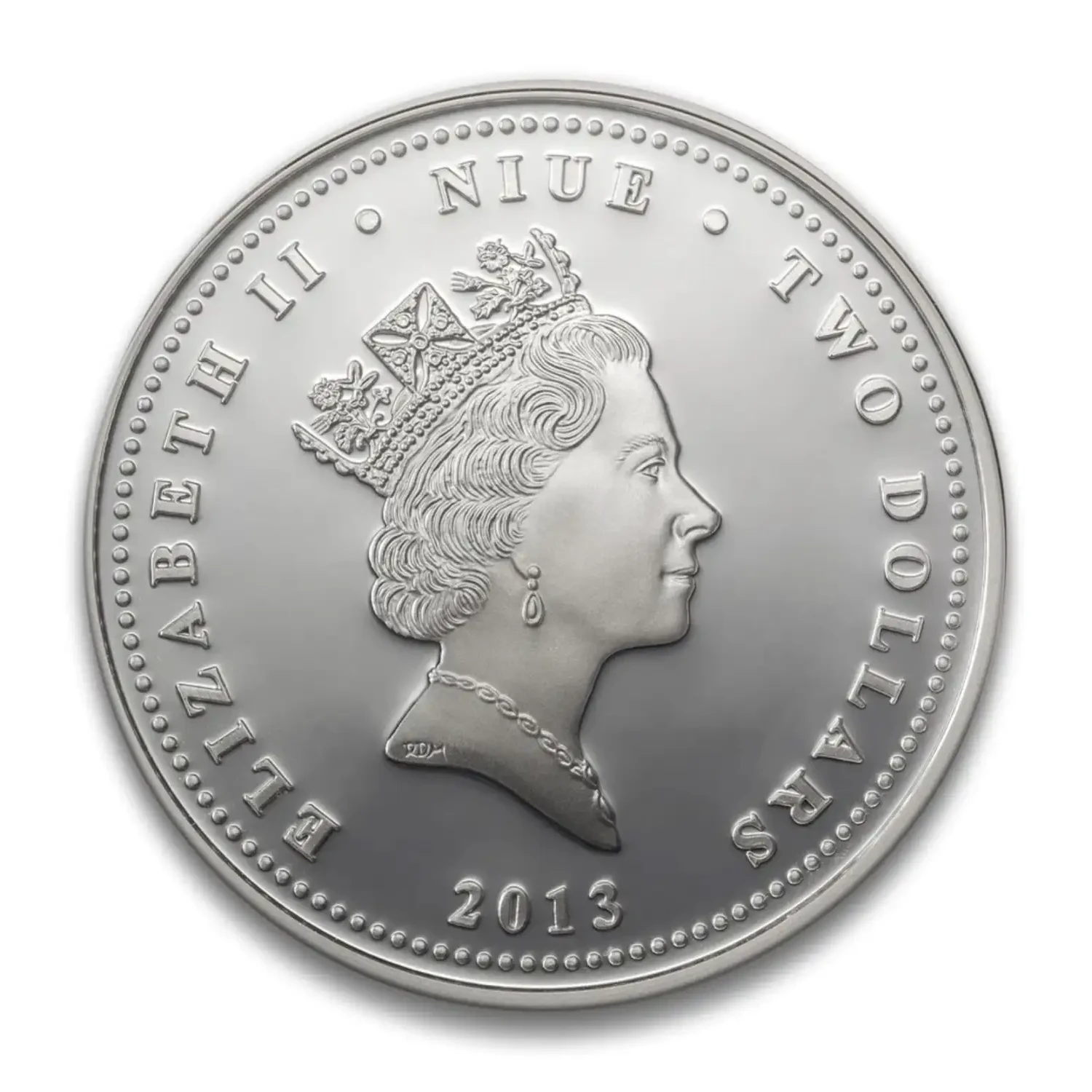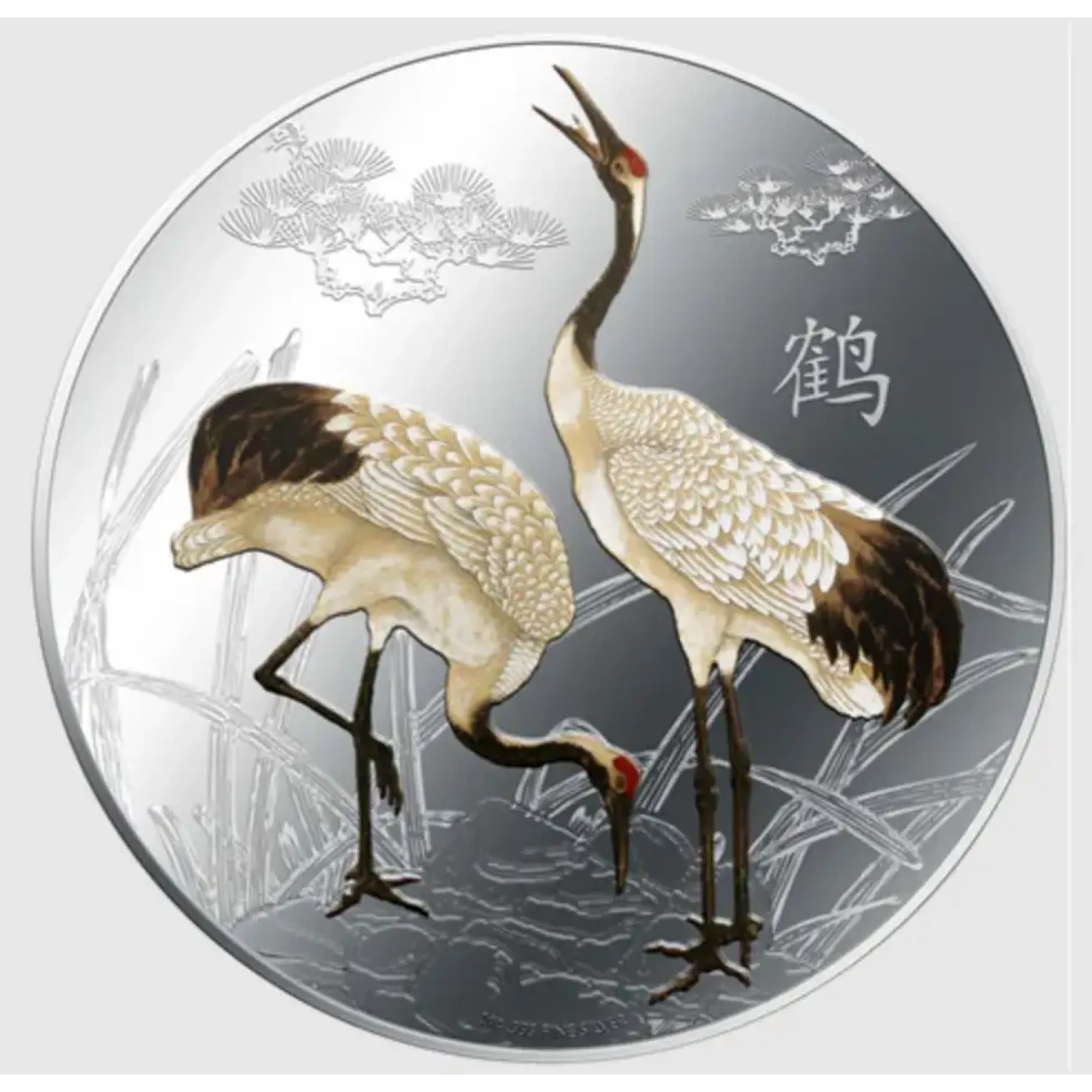 This delightful coin issued by the New Zealand Mint shows two Cranes with one bird looking upwards, symbolizing authority and wisdom. As in traditional Chinese paintings, these cranes are surrounded by reeds and pine tree branches representing constant friendship.