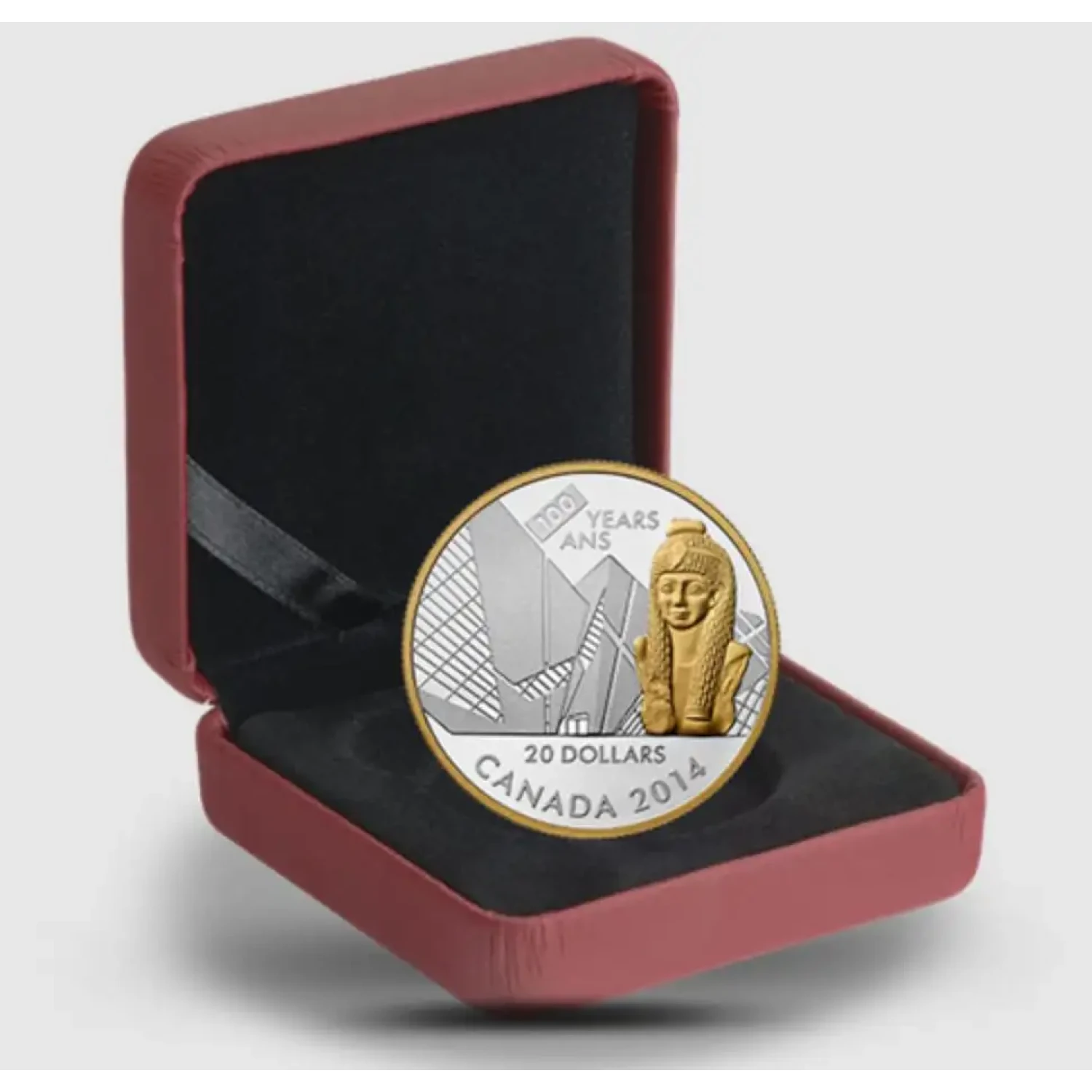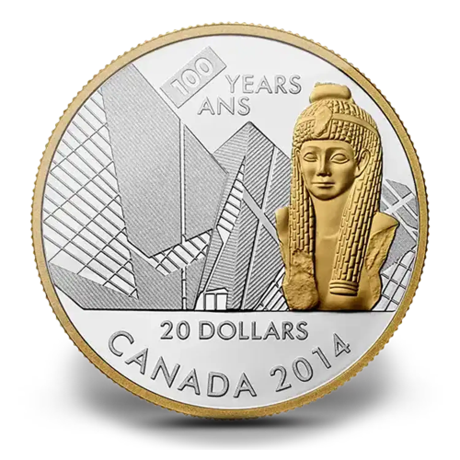 The design features a gold plated image of a bust of Cleopatra VII (one of the museum's very first acquisitions in the early 1900s) against a backdrop of the world-renowned Michael Lee-Chin Crystal addition to the initial building. The museum, one of the largest in North America, attracts over one million visitors per year, and is noted world-wide for its contributions as a field-research institution, conducting research that spans all corners of the globe. 40 varying galleries and over six million items within their collections contribute to the Royal Ontario Museum's global popularity. On the front of the coin is the word “CANADA”, the date “2014”, the face value of “20 DOLLARS” and “100 YEARS ANS” are engraved.