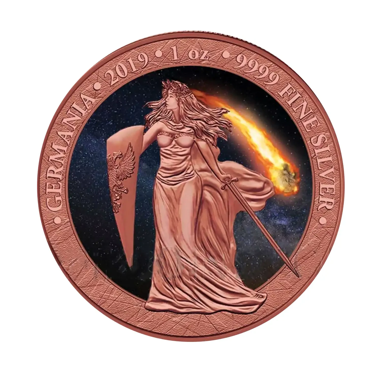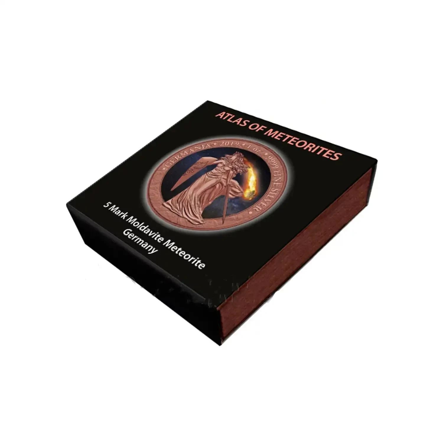 Superior craftsmanship and a very low mintage give grounds to an increase in the value of the coin. The coin is plated with Red Gold Plating and has a real piece of the Moldavite Meteorite.Each specimen is packed in a beautiful case with a dust jacket and has a numbered certificate.