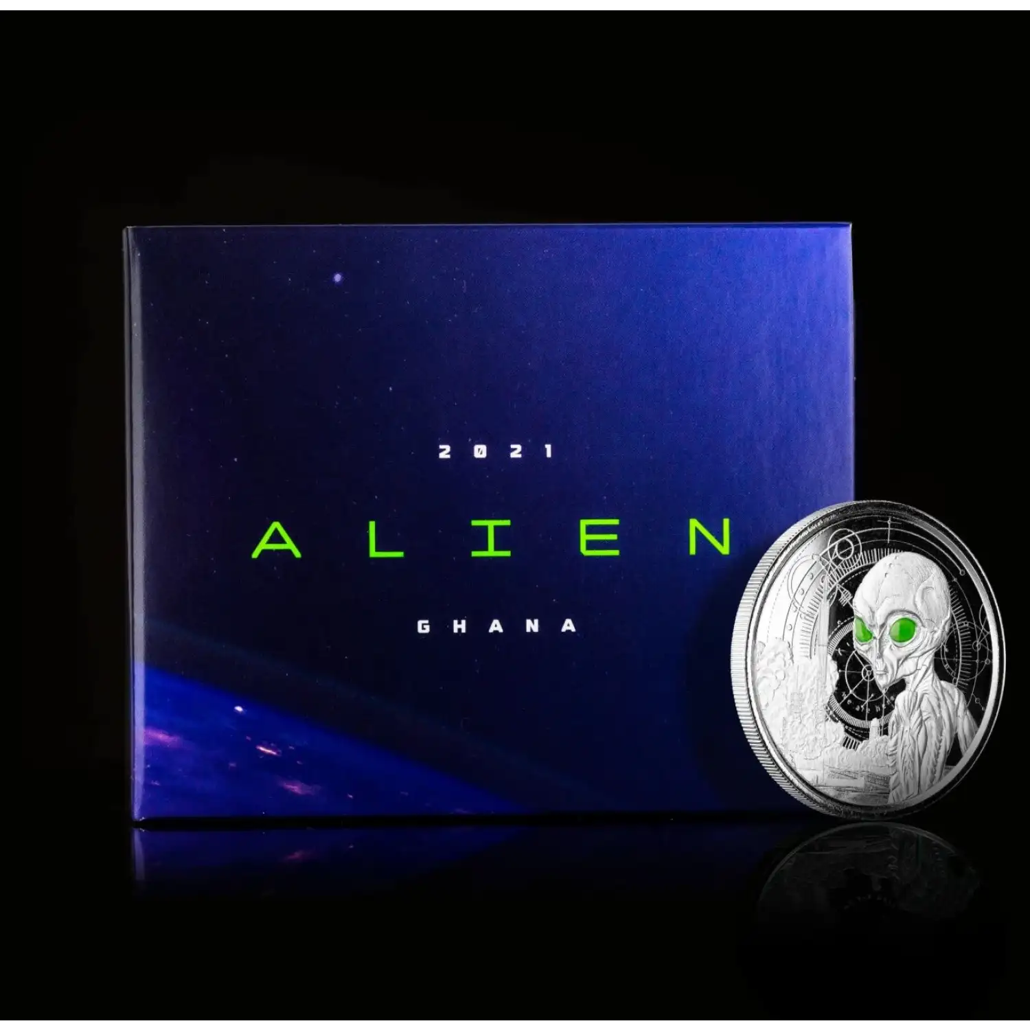 Introducing, the first of its kind, the Ghana Alien Coin. This is the ULTIMATE coin series for fans, featuring a space-inspired design and UV ink revealing a glow-in-the-dark message only "they" can see.