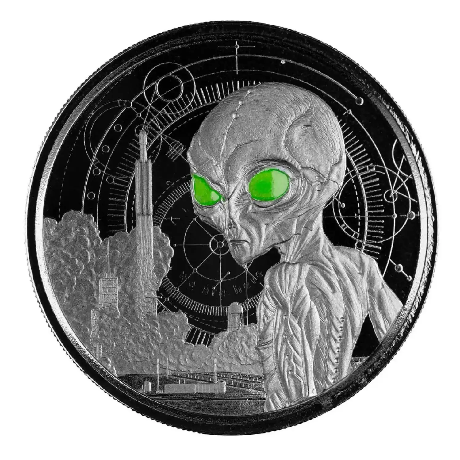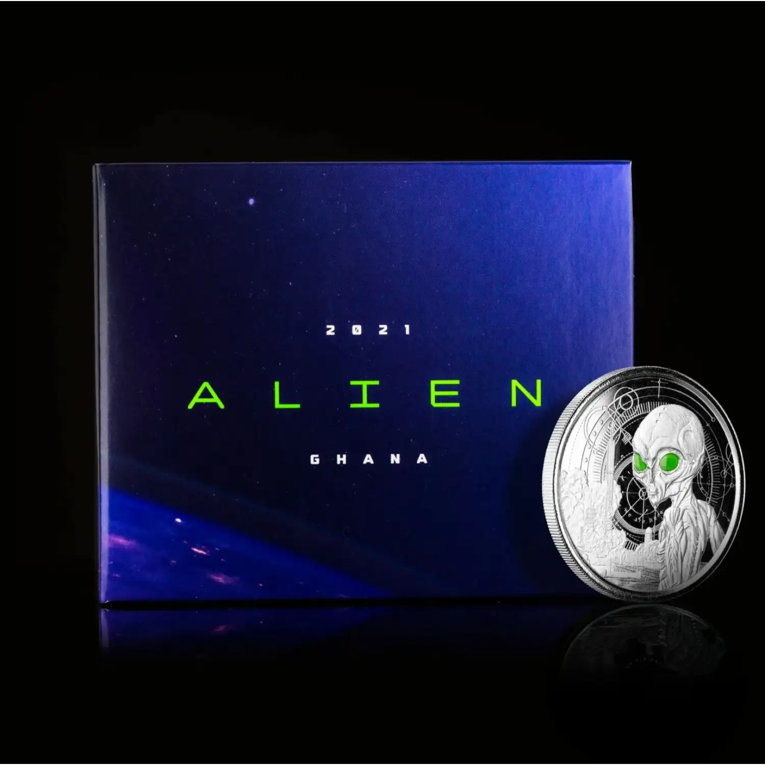Introducing, the first of its kind, the Ghana Alien Coin. This is the ULTIMATE coin series for fans, featuring a space-inspired design and UV ink revealing a glow-in-the-dark message only "they" can see.
