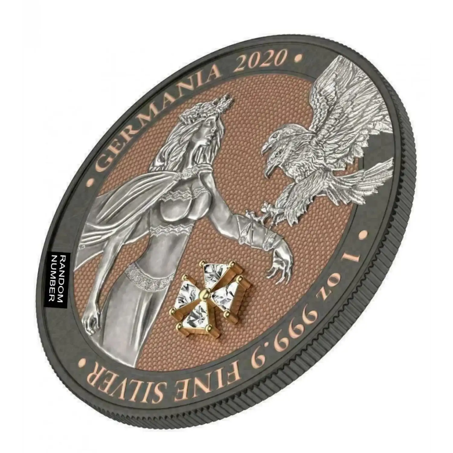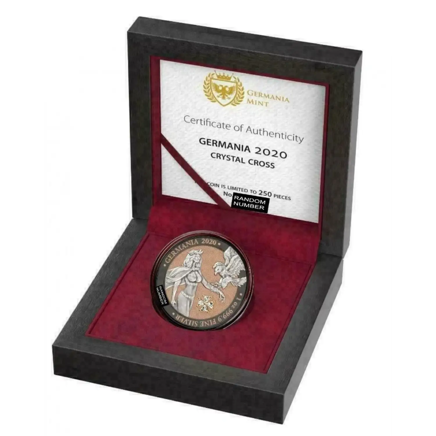 New directly from the Mint Genuine 100% Authentic 1 Oz Silver Coin 2020 5 Mark Germania - Ruthenium White Crystal Cross. Unique design and Limited Edition.