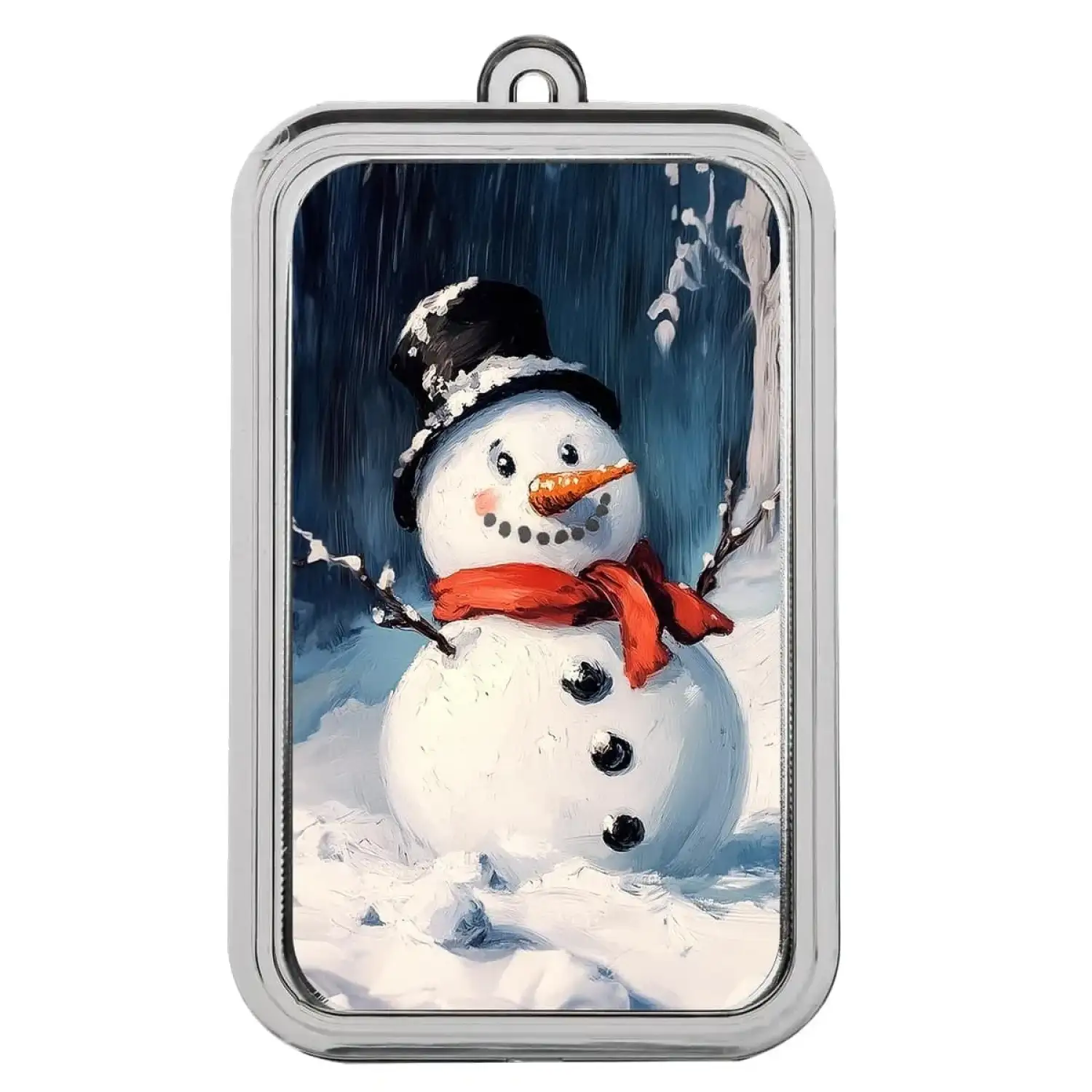 Bring a smile to your holiday season with the Winter Snowman – 1 oz .999 Fine Silver Colorized Bar. This charming design captures the heart of winter fun, featuring a cheerful snowman dressed in a bright red scarf and top hat, standing proudly against a backdrop of freshly fallen snow. With his carrot nose, coal eyes, and jolly grin, he embodies the simple joy and magic that make Christmastime so special.