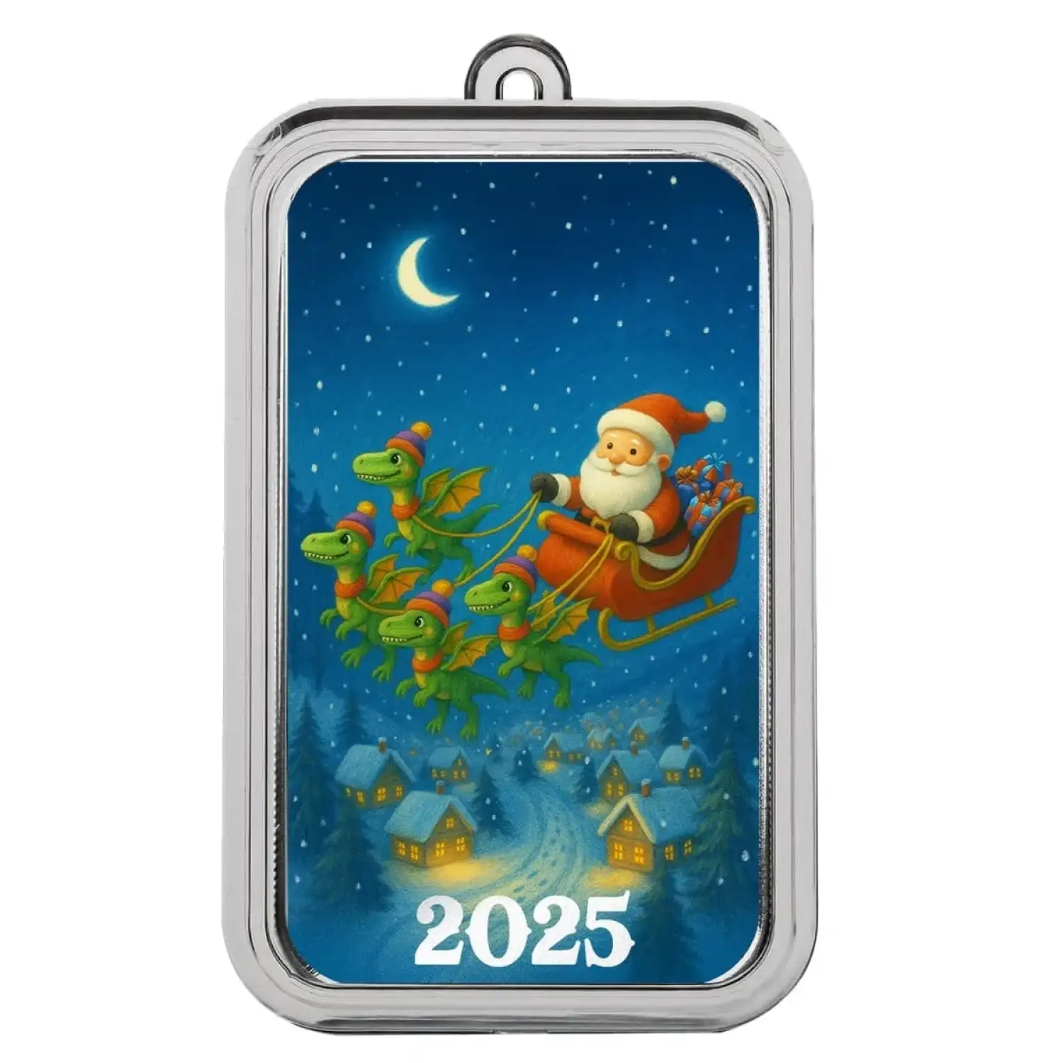 Take your Christmas collection on a prehistoric adventure with the Dinosaur Sleigh Ride – 1 oz .999 Fine Silver Bar. This playful and imaginative design reimagines Santa’s classic sleigh ride in the most unexpected way — with a team of bright green dinosaurs pulling his sleigh through a starry winter sky. Santa holds the reins with a joyful grin, his sack of gifts flying behind him as snowflakes swirl below. It’s a whimsical and unforgettable twist on Christmas tradition that brings smiles to both the young and the young at heart.