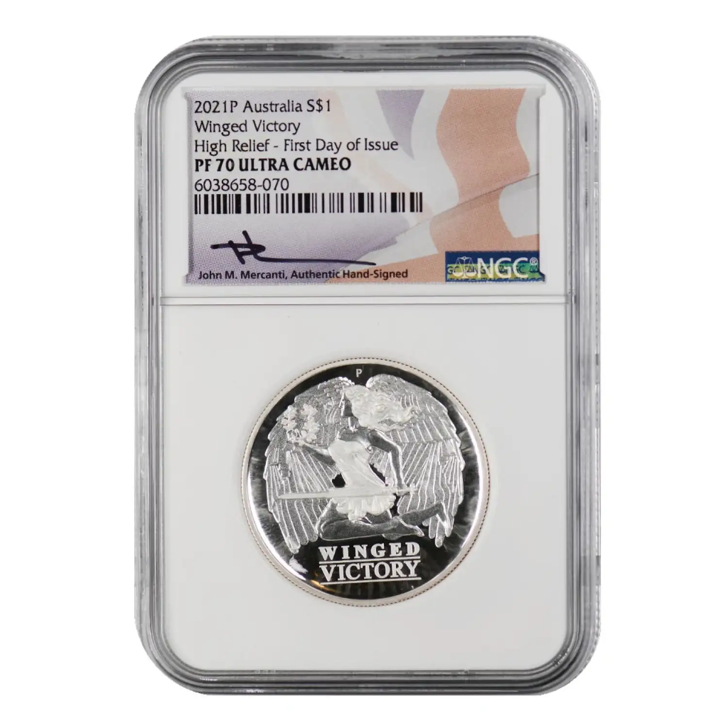2021 P Australia Winged Victory 1 oz Silver NGC PF-70 High Releif First Day of Issue