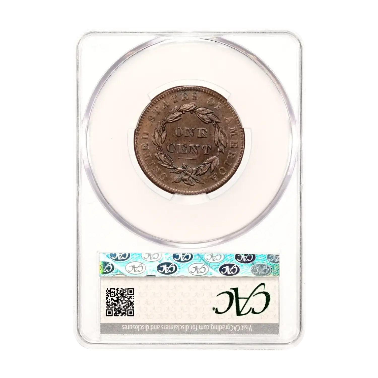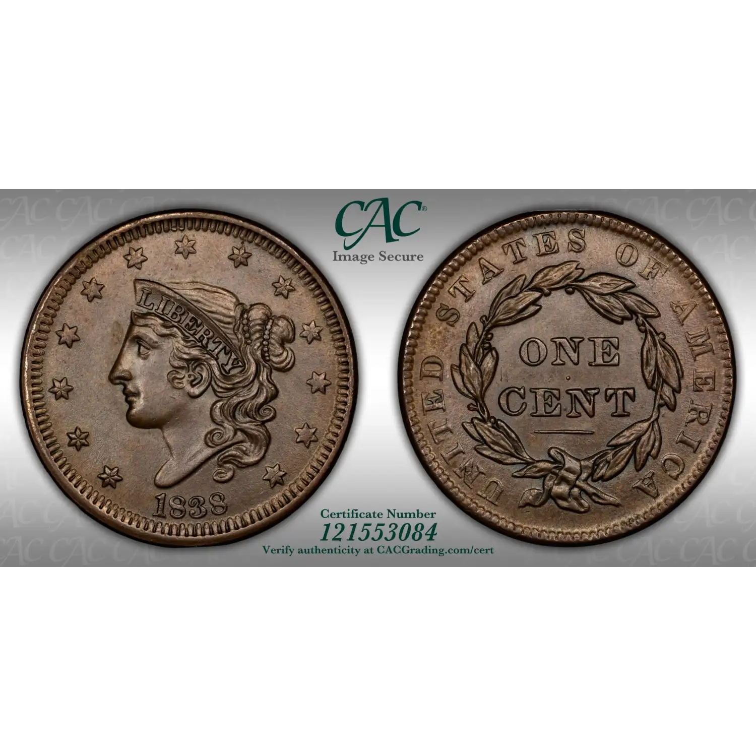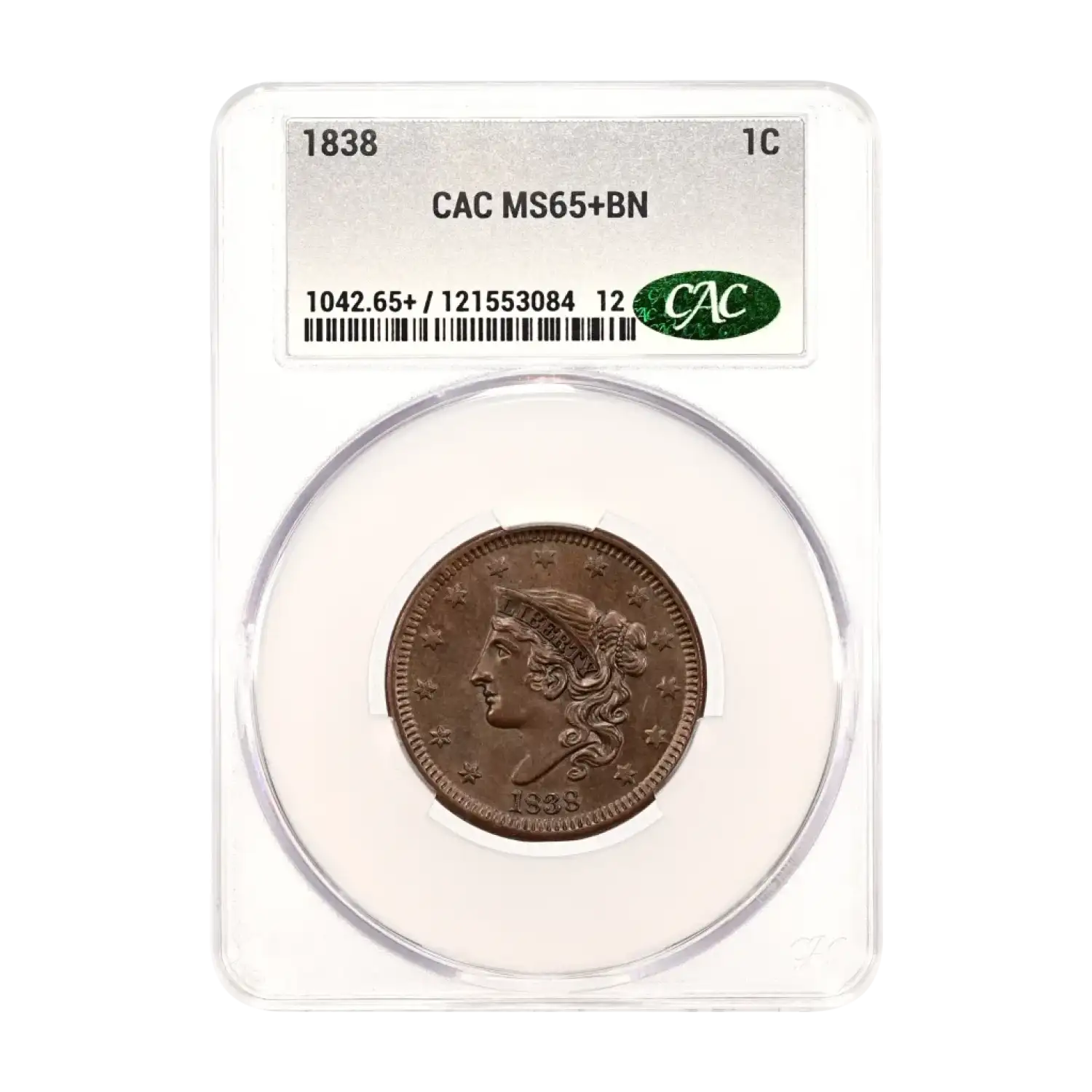 1838 Coronet Head Large Cent CACG MS 65+ BN CAC