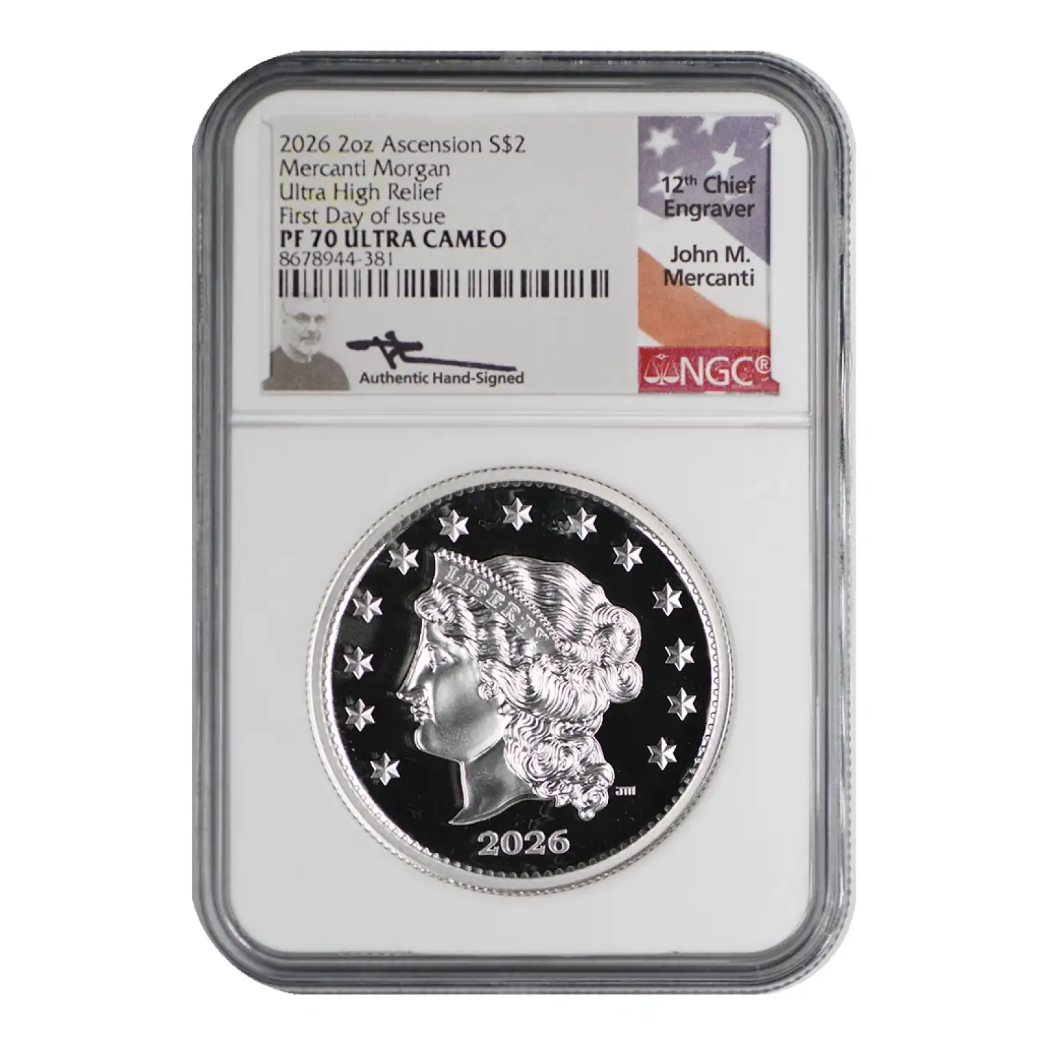 2026 S Ascension Mercanti Morgan 2 oz Silver NGC PF-70 Ultra-High Relief, First day of Issue, Ultra Cameo