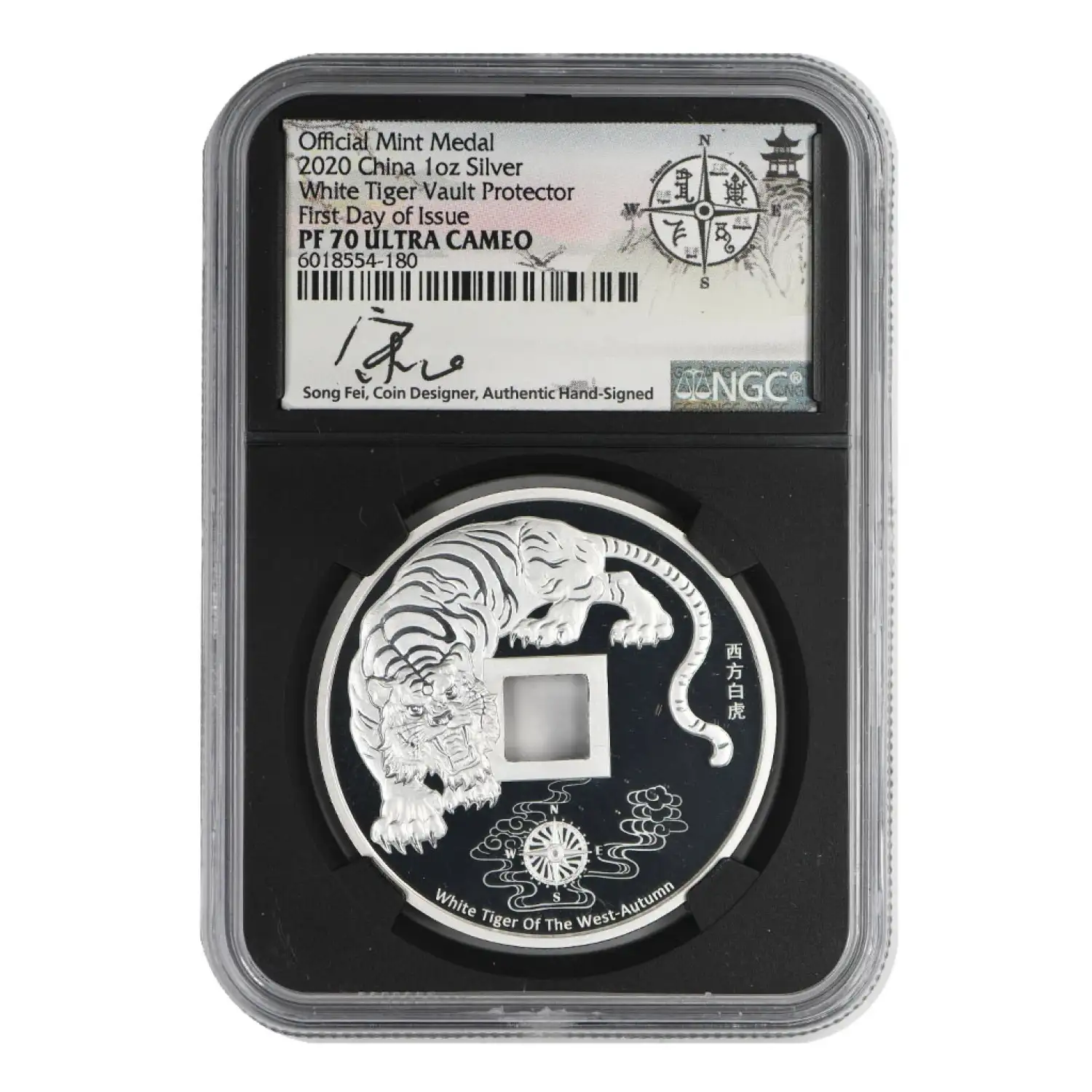 2020 Chinese Official Mint Medal 1 oz Silver NGC PF-70 White Tiger Vault Protector, First day of Issue, Ultra Cameo