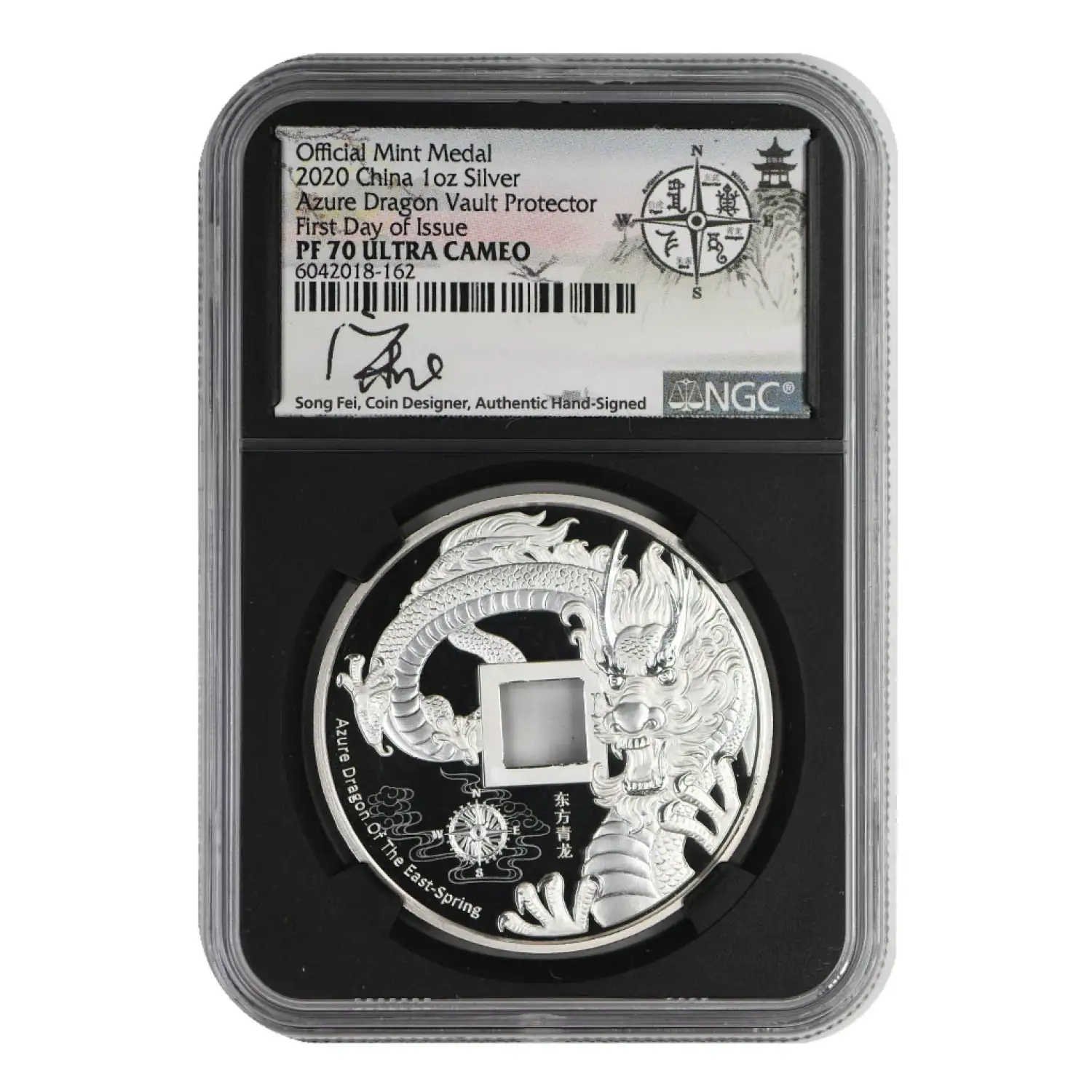 2020 Chinese Official Mint Medal 1 oz Silver NGC PF-70 Azure Dragon Vault Protector, First day of Issue, Ultra Cameo