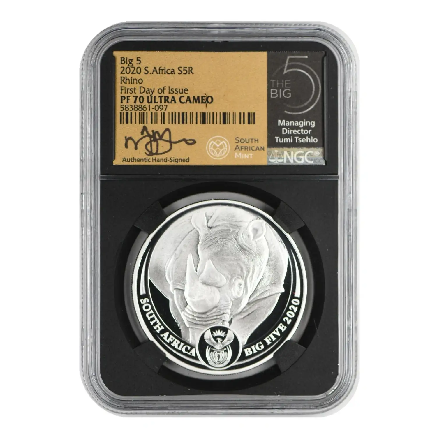 2020 South Africa The Big Five 1 oz Silver NGC PF-70 Rhino, First day of Issue, Ultra Cameo