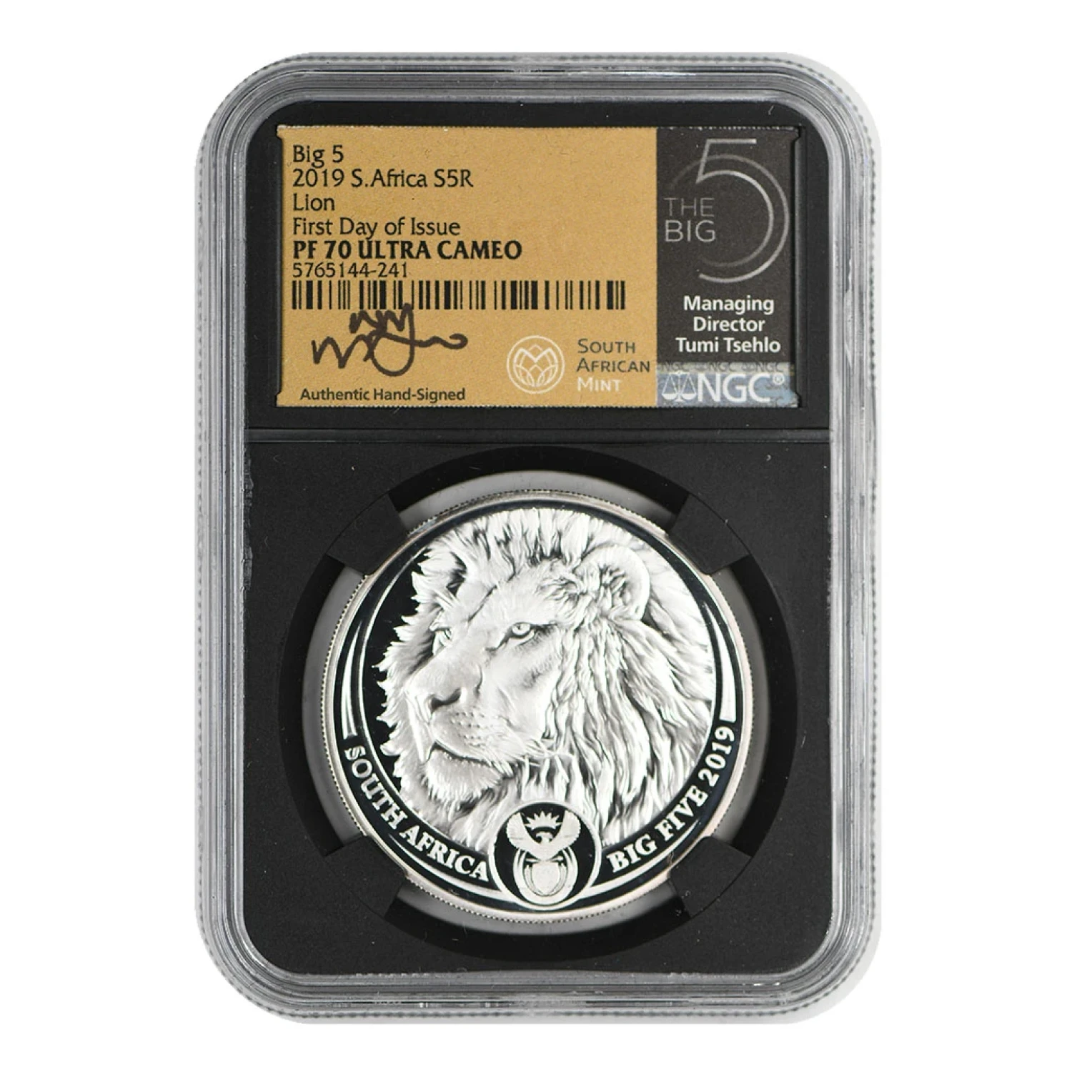 2019 South Africa The Big Five 1 oz Silver NGC PF-70 Lion, First day of Issue, Ultra Cameo