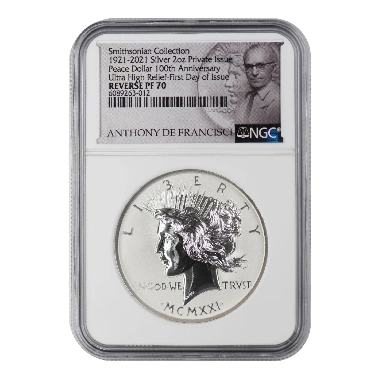 2021 Private Issued Medals NGC PF-70 Smithsonian Collection, 1921-2021 Silver 2 oz, Peace Dollar 100th Anniv, Ultra High Relief, First day of Issue, Reverse Proof