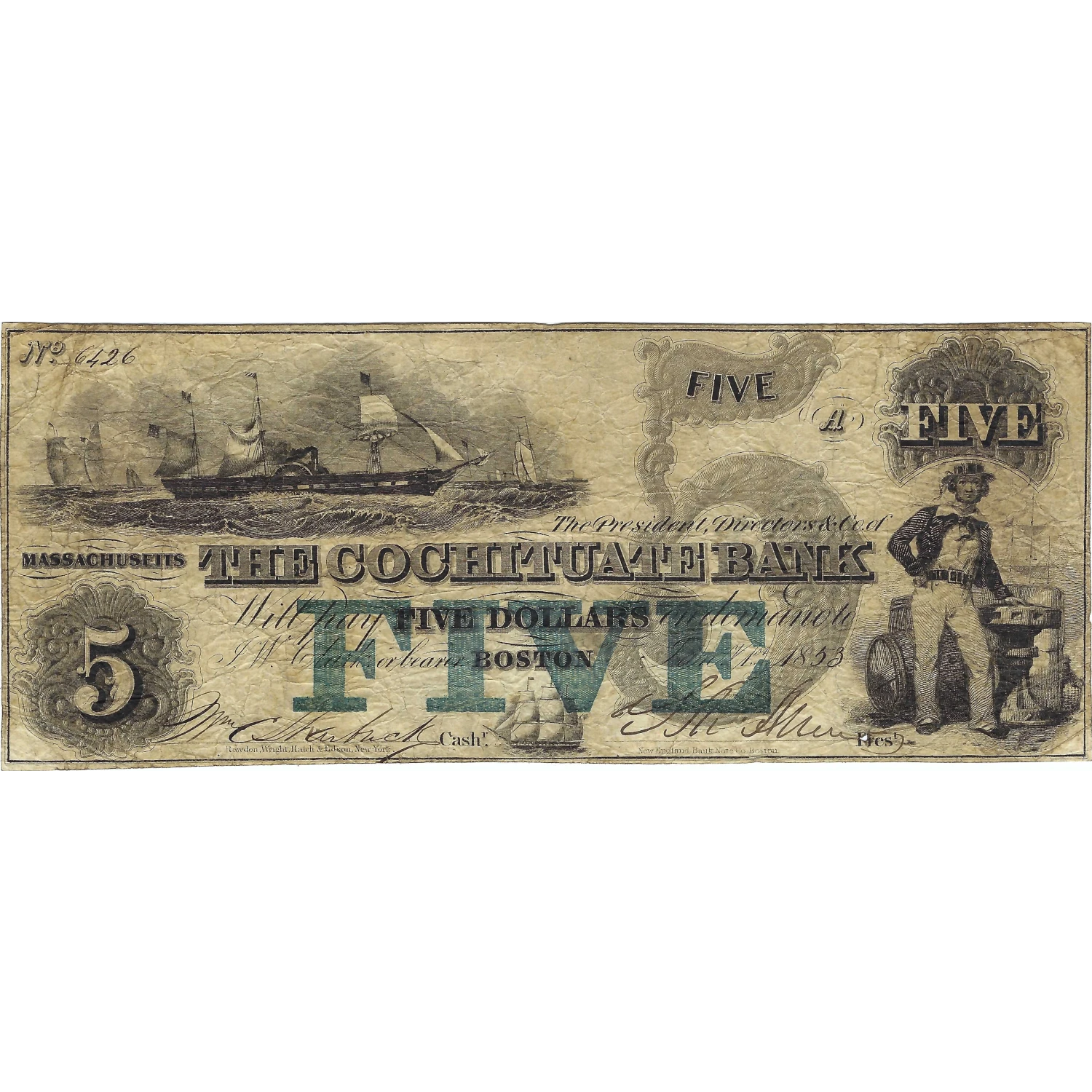 $5 U.S. Obsolete Currency, Cochituate Bank Boston MA