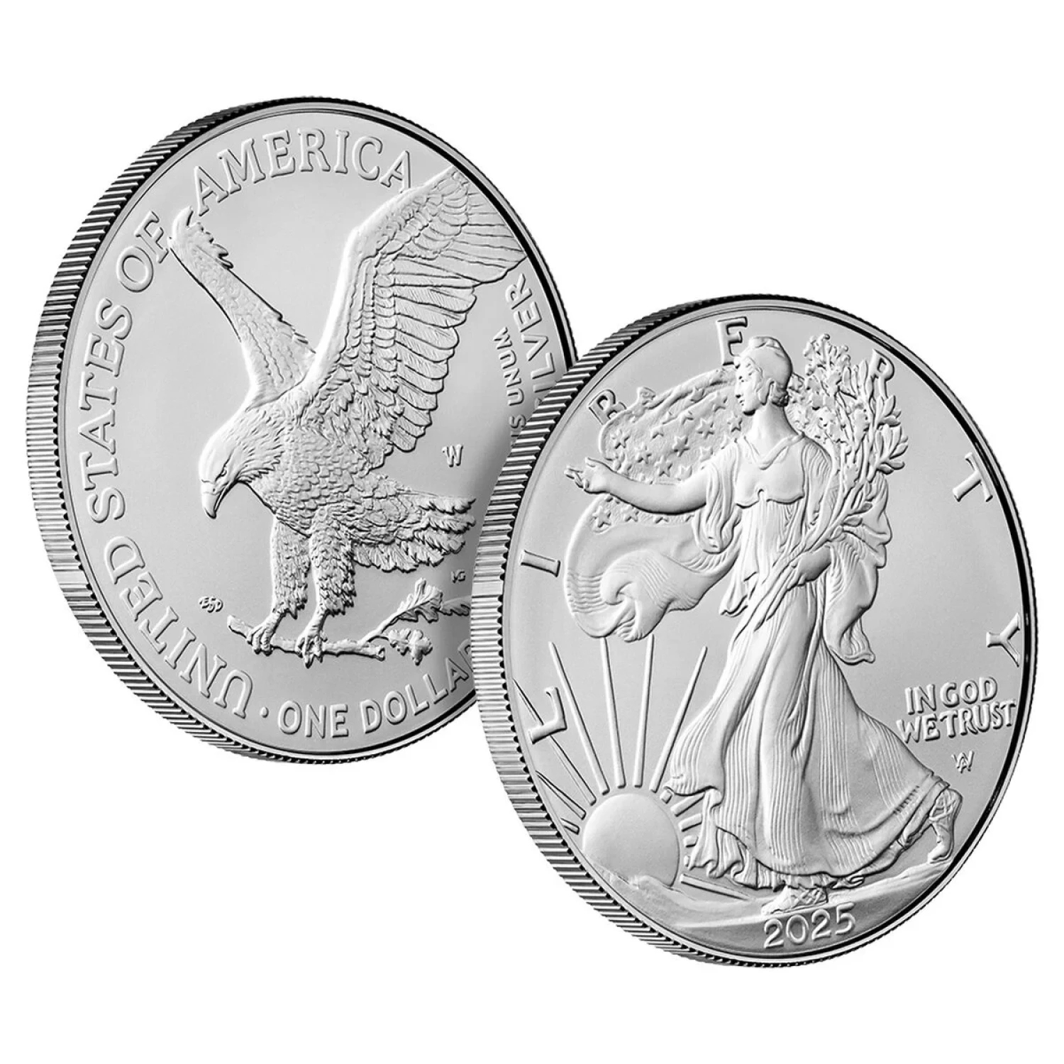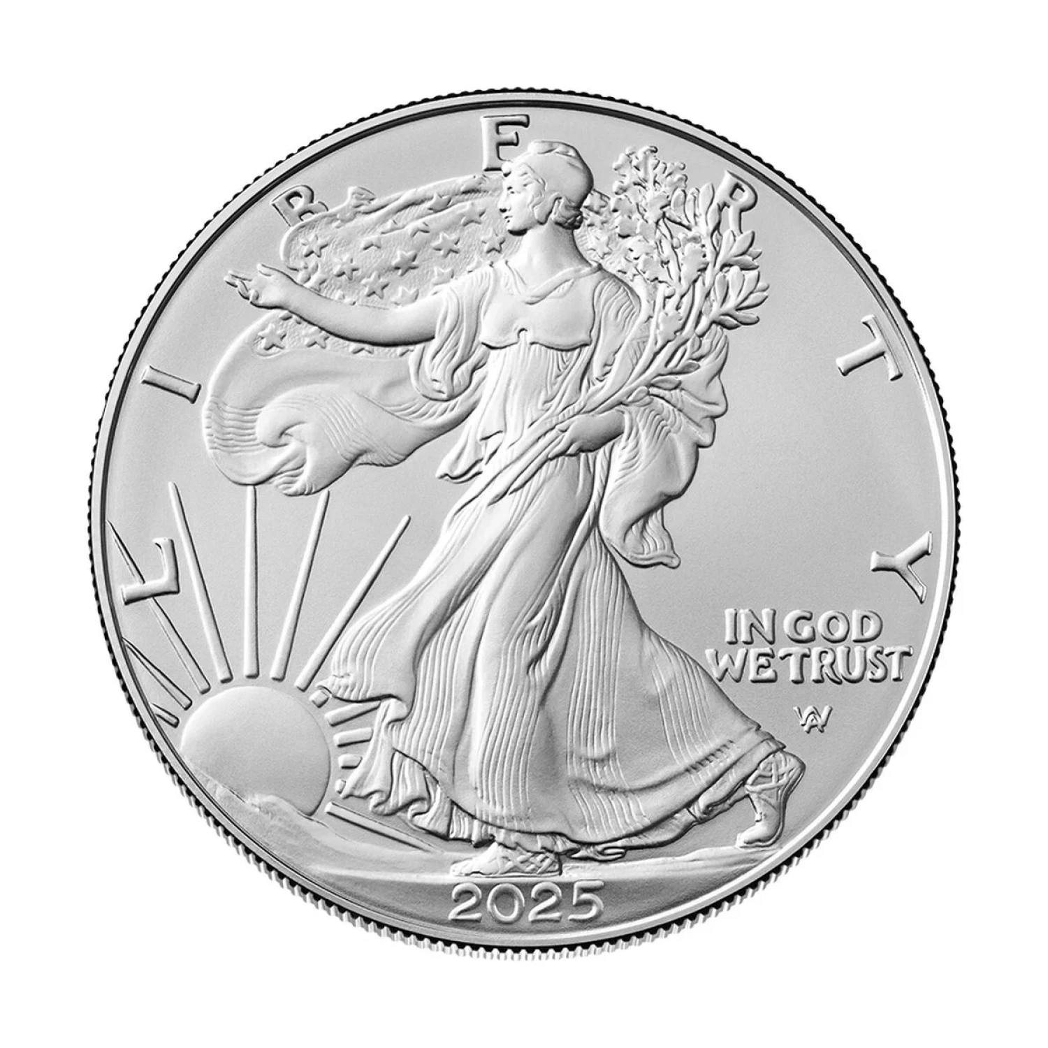 The classic “Walking Liberty” design by Adolph A. Weinman featured on the coin’s obverse (heads) has long been a collector favorite. The obverse features a full-length figure of Liberty in stride, enveloped in folds of the flag, with her right hand extended and branches of laurel and oak in her left. The United States Mint returned to its original historical assets to render a closer reflection of Weinman’s original vision and detail that includes the addition of his traditional artist mark. Inscriptions are “LIBERTY,” “IN GOD WE TRUST,” and “2025.”