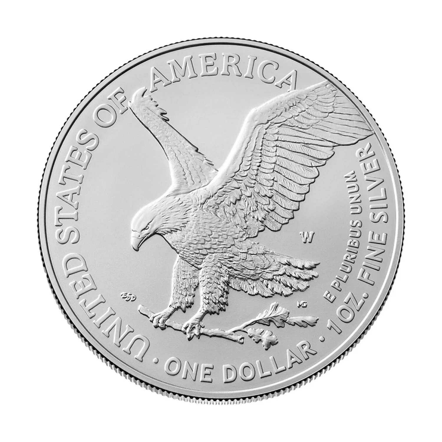 The reverse (tails) design was introduced in 2021 and features an eagle as it approaches a landing, carrying an oak branch, as if to add it to a nest. The coins have also been updated with a reeded edge variation for enhanced security. Inscriptions are “UNITED STATES OF AMERICA,” “E PLURIBUS UNUM,” “1 OZ. FINE SILVER,” and “ONE DOLLAR.”
