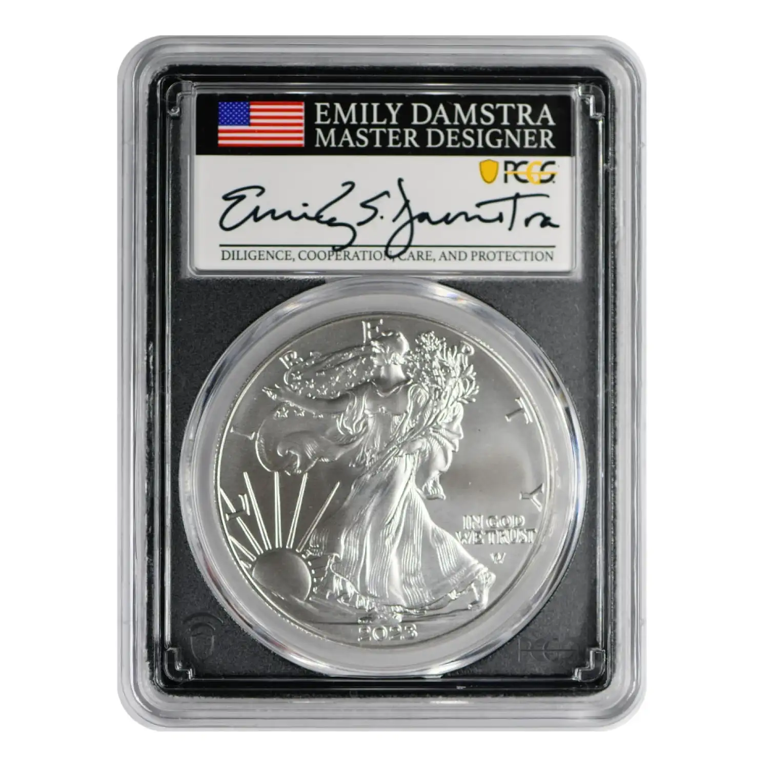 | Variety | Burnished Silver Eagle FDI Damstra Flag |
