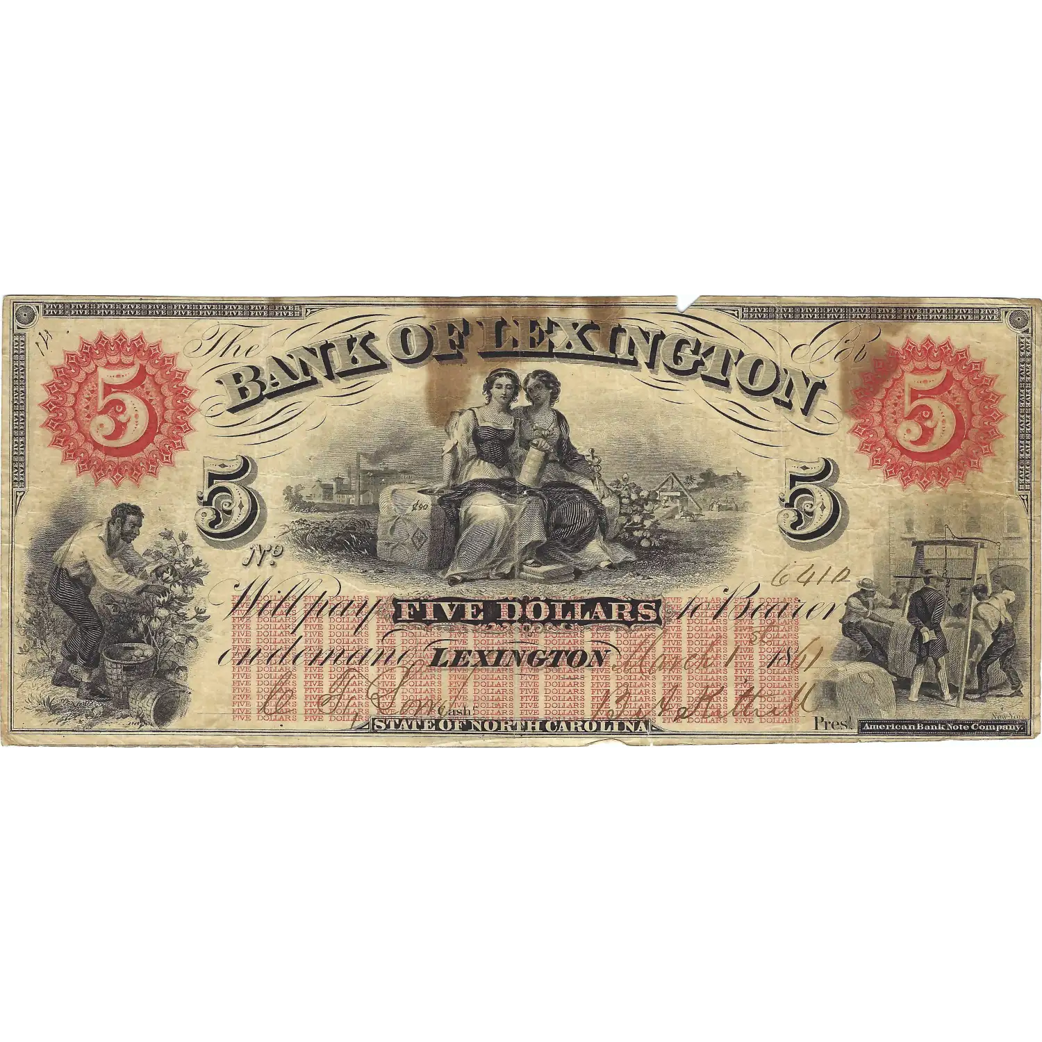 U.S. Obsolete Currency, $5 Bank of Lexington, North Carolina, Circulated